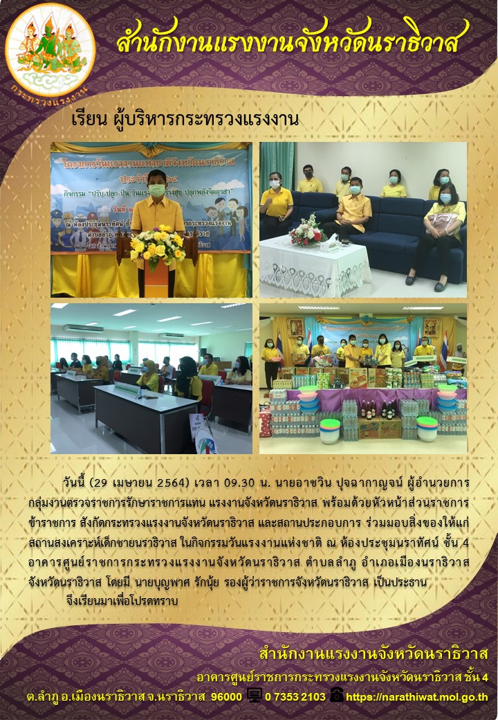 วันนี้ (29 เมษายน 2564) เวลา 09.30 น. นายอาชวิน ปุจฉากาญจน์ ผู้อำนวยการกลุ่มงานตรวจราชการรักษาราชการแทน แรงงานจังหวัดนราธิวาส พร้อมด้วยหัวหน้าส่วนราชการ ข้าราชการ สังกัดกระทรวงแรงงานจังหวัดนราธิวาส และสถานประกอบการ ร่วมมอบสิ่งของให้แก่สถานสงเคราะห์เด็กชายนราธิวาส ในกิจกรรมวันแรงงานแห่งชาติ ณ ห้องประชุมนราทัศน์ ชั้น 4 อาคารศูนย์ราชการกระทรวงแรงงานจังหวัดนราธิวาส ตำบลลำภู อำเภอเมืองนราธิวาสจังหวัดนราธิวาส โดยมี นายบุญพาศ รักนุ้ย รองผู้ว่าราชการจังหวัดนราธิวาส เป็นประธาน