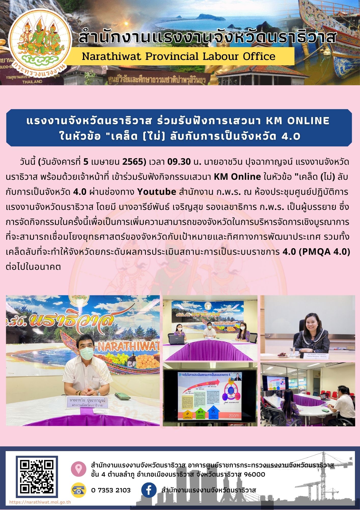 วันนี้ (วันอังคารที่ 5 เมษายน 2565) เวลา 09.30 น. นายอาชวิน ปุจฉากาญจน์ แรงงานจังหวัดนราธิวาส พร้อมด้วยเจ้าหน้าที่ เข้าร่วมรับฟังกิจกรรมเสวนา KM Online ในหัวข้อ “เคล็ด (ไม่) ลับกับการเป็นจังหวัด 4.0 ผ่านช่องทาง Youtube สำนักงาน ก.พ.ร. ณ ห้องประชุมศูนย์ปฏิบัติการแรงงานจังหวัดนราธิวาส โดยมี นางอารีย์พันธ์ เจริญสุข รองเลขาธิการ ก.พ.ร. เป็นผู้บรรยาย ซึ่งการจัดกิจกรรมในครั้งนี้เพื่อเป็นการเพิ่มความสามารถของจังหวัดในการบริหารจัดการเชิงบูรณาการที่จะสามารถเชื่อมโยงยุทธศาสตร์ของจังหวัดกับเป้าหมายและทิศทางการพัฒนาประเทศ รวมทั้งเคล็ดลับที่จะทำให้จังหวัดยกระดับผลการประเมินสถานะการเป็นระบบราชการ 4.0 (PMQA 4.0) ต่อไปในอนาคต