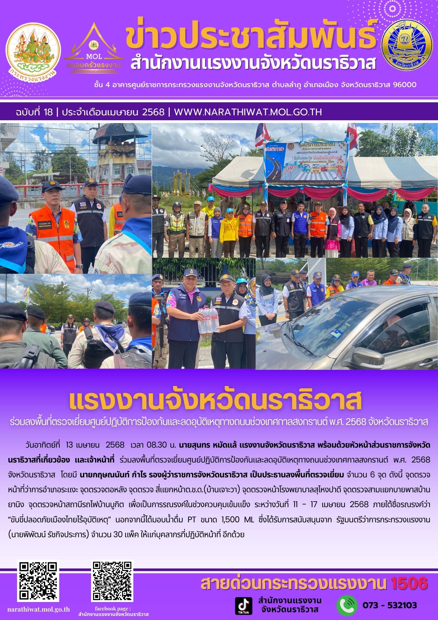 วันอาทิตย์ที่ 13 เมษายน 2568 เวลา 08.30 น. นายสุนทร หมัดแล้ แรงงานจังหวัดนราธิวาส พร้อมด้วยหัวหน้าส่วนราชการจังหวัดนราธิวาสที่เกี่ยวข้อง และเจ้าหน้าที่ ร่วมลงพื้นที่ตรวจเยี่ยมศูนย์ปฏิบัติการป้องกันและลดอุบัติเหตุทางถนนช่วงเทศกาลสงกรานต์ พ.ศ. 2568 จังหวัดนราธิวาส โดยมี นายกฤษณนันท์ กำไร รองผู้ว่าราชการจังหวัดนราธิวาส เป็นประธานลงพื้นที่ตรวจเยี่ยม จำนวน 6 จุด ดังนี้ จุดตรวจหน้าที่ว่าการอำเภอระแงะ จุดตรวจตอหลัง จุดตรวจ สี่แยกหน้าต.ช.ด.(บ้านเจาะวา) จุดตรวจหน้าโรงพยาบาลสุไหงปาดี จุดตรวจสามแยกบายพาสบ้านยานิง จุดตรวจหน้าสถานีรถไฟบ้านบูกิต เพื่อเป็นการรณรงค์ในช่วงควบคุมเข้มแข็ง ระหว่างวันที่ 11 – 17 เมษายน 2568 ภายใต้ชื่อรณรงค์ว่า “ขับขี่ปลอดภัยเมืองไทยไร้อุบัติเหตุ” นอกจากนี้ได้มอบน้ำดื่ม PT ขนาด 1,500 ML ซึ่งได้รับการสนับสนุนจาก รัฐมนตรีว่าการกระทรวงแรงงาน (นายพิพัฒน์ รัชกิจประการ) จำนวน 30 แพ็ค ให้แก่บุคลากรที่ปฏิบัติหน้าที่ อีกด้วย