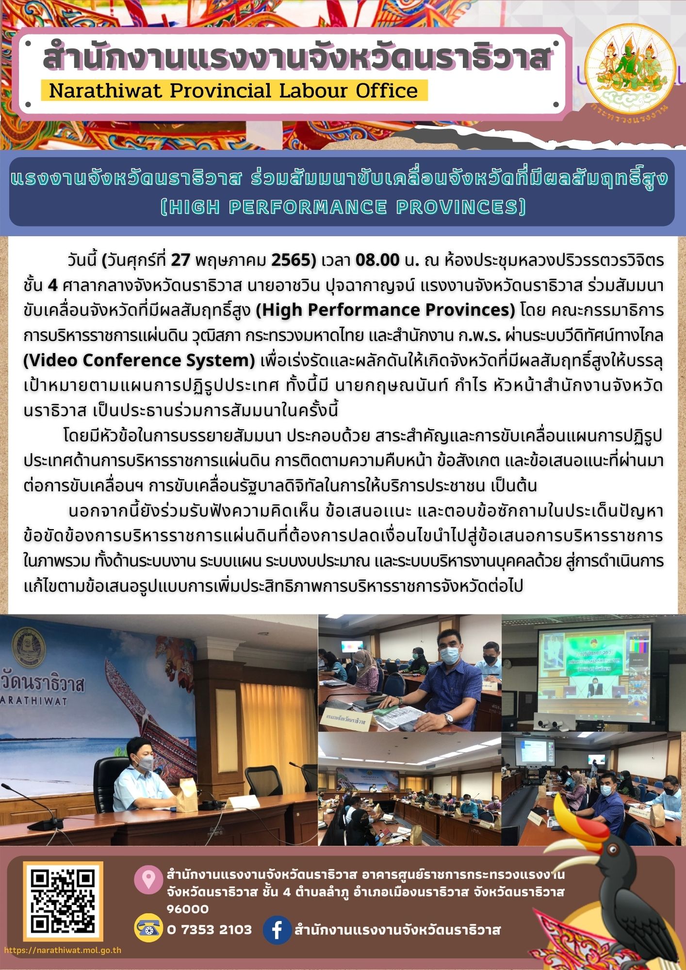 วันนี้ (วันศุกร์ที่ 27 พฤษภาคม 2565) เวลา 08.00 น. ณ ห้องประชุมหลวงปริวรรตวรวิจิตร ชั้น 4 ศาลากลางจังหวัดนราธิวาส นายอาชวิน ปุจฉากาญจน์ แรงงานจังหวัดนราธิวาส ร่วมสัมมนาขับเคลื่อนจังหวัดที่มีผลสัมฤทธิ์สูง (High Performance Provinces) โดย คณะกรรมาธิการการบริหารราชการแผ่นดิน วุฒิสภา กระทรวงมหาดไทย และสำนักงาน ก.พ.ร. ผ่านระบบวีดิทัศน์ทางไกล (Video Conference System) เพื่อเร่งรัดและผลักดันให้เกิดจังหวัดที่มีผลสัมฤทธิ์สูงให้บรรลุเป้าหมายตามแผนการปฏิรูปประเทศ ทั้งนี้มี นายกฤษณนันท์ กำไร หัวหน้าสำนักงานจังหวัดนราธิวาส เป็นประธานร่วมการสัมมนาในครั้งนี้