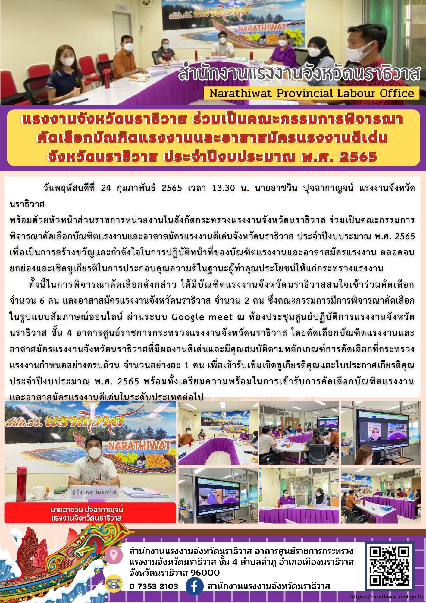 วันพฤหัสบดีที่ 24 กุมภาพันธ์ 2565 เวลา 13.30 น. นายอาชวิน ปุจฉากาญจน์ แรงงานจังหวัดนราธิวาส พร้อมด้วยหัวหน้าส่วนราชการหน่วยงานในสังกัดกระทรวงแรงงานจังหวัดนราธิวาส ร่วมเป็นคณะกรรมการพิจารณาคัดเลือกบัณฑิตแรงงานและอาสาสมัครแรงงานดีเด่นจังหวัดนราธิวาส ประจำปีงบประมาณ พ.ศ. 2565 เพื่อเป็นการสร้างขวัญและกำลังใจในการปฏิบัติหน้าที่ของบัณฑิตแรงงานและอาสาสมัครแรงงาน ตลอดจนยกย่องและเชิดชูเกียรติในการประกอบคุณความดีในฐานะผู้ทำคุณประโยชน์ให้แก่กระทรวงแรงงาน