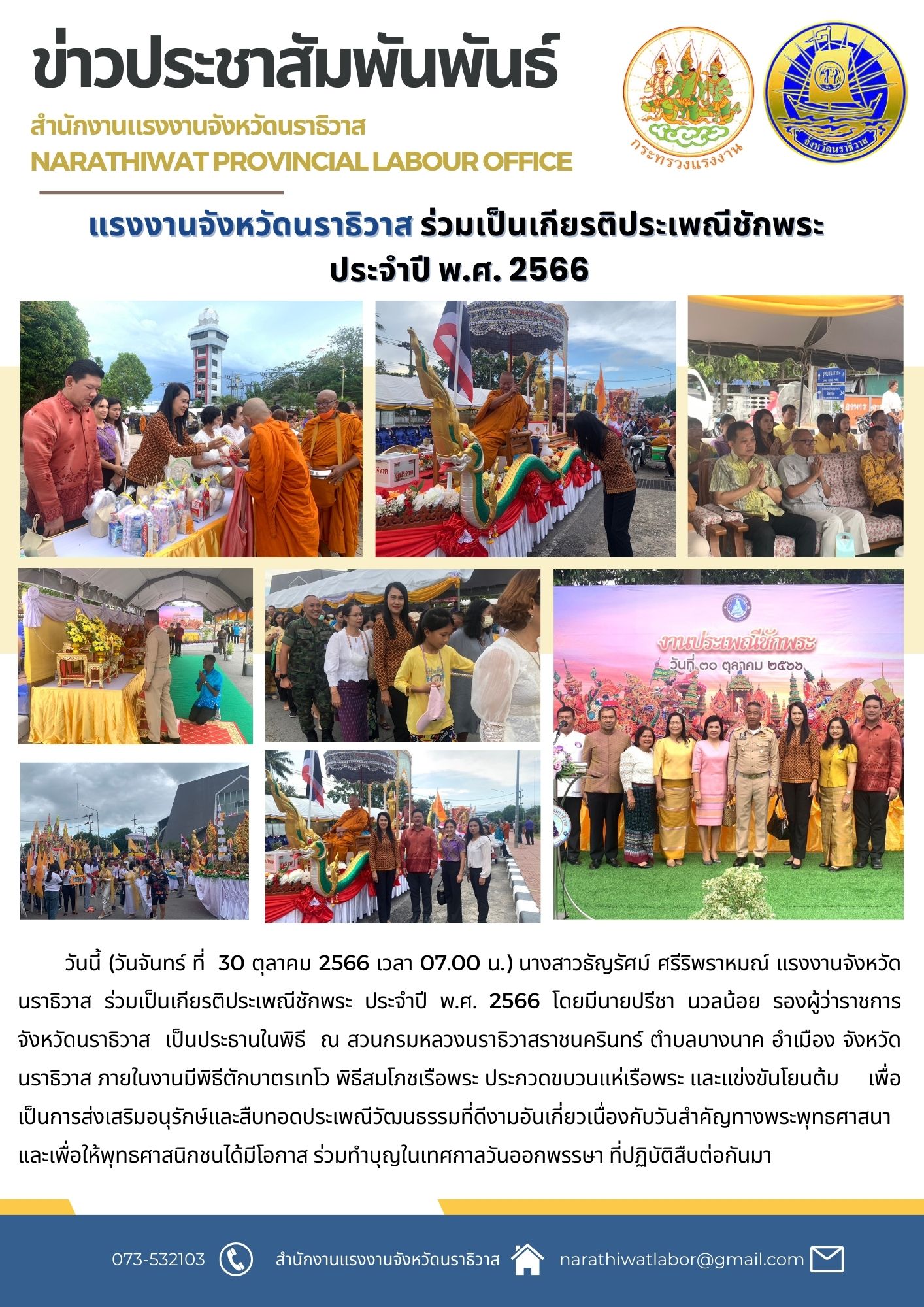 วันนี้ (วันจันทร์ ที่ 30 ตุลาคม 2566 เวลา 07.00 น.) นางสาวธัญรัศม์ ศรีริพราหมณ์ แรงงานจังหวัดนราธิวาส ร่วมเป็นเกียรติประเพณีชักพระ ประจำปี พ.ศ. 2566 โดยมีนายปรีชา นวลน้อย รองผู้ว่าราชการจังหวัดนราธิวาส เป็นประธานในพิธี ณ สวนกรมหลวงนราธิวาสราชนครินทร์ ตำบลบางนาค อำเมือง จังหวัดนราธิวาส ภายในงานมีพิธีตักบาตรเทโว พิธีสมโภชเรือพระ ประกวดขบวนแห่เรือพระ และแข่งขันโยนต้ม เพื่อเป็นการส่งเสริมอนุรักษ์และสืบทอดประเพณีวัฒนธรรมที่ดีงามอันเกี่ยวเนื่องกับวันสำคัญทางพระพุทธศาสนาและเพื่อให้พุทธศาสนิกชนได้มีโอกาส ร่วมทำบุญในเทศกาลวันออกพรรษา ที่ปฏิบัติสืบต่อกันมา