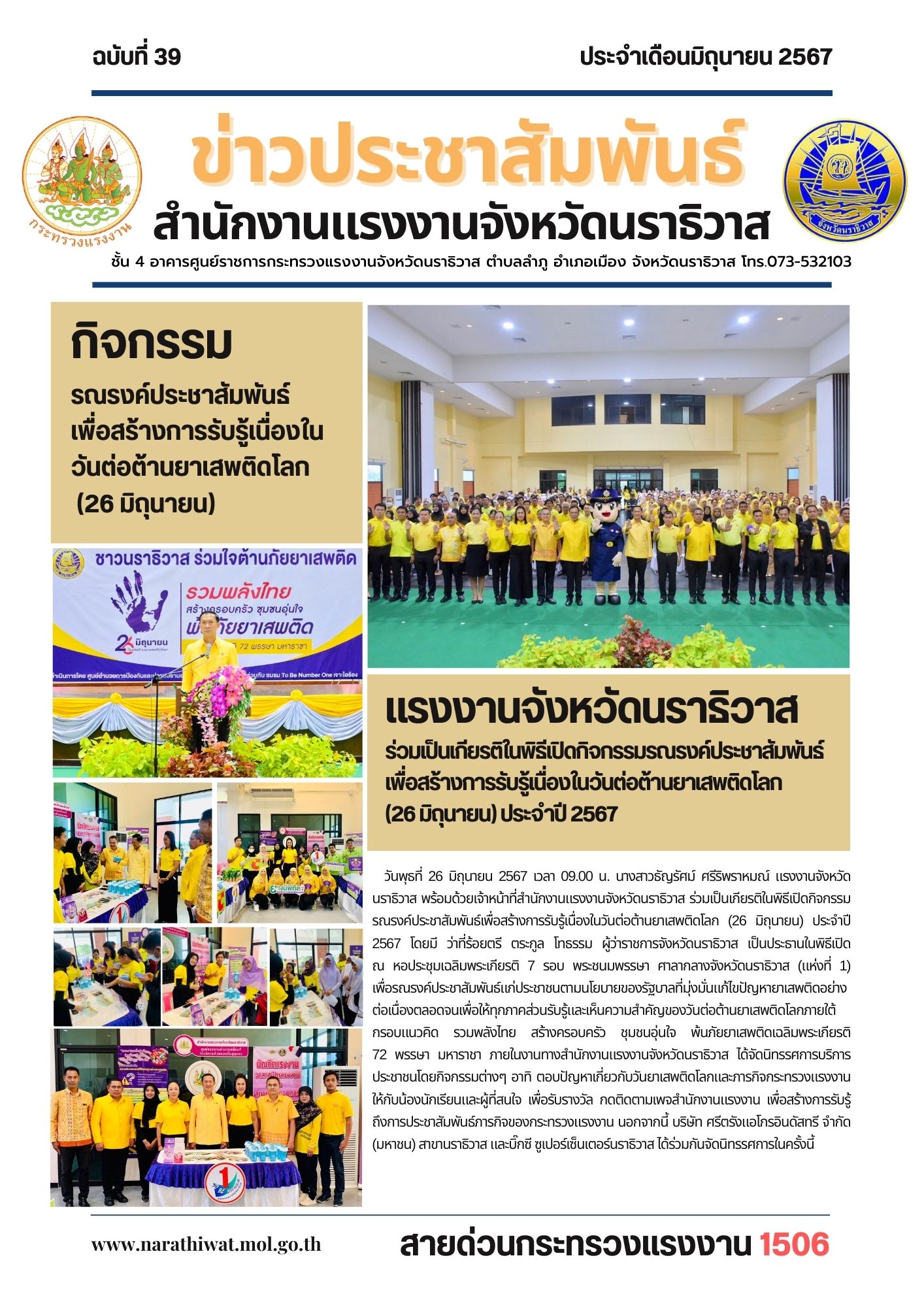 วันพุธที่ 26 มิถุนายน 2567 เวลา 09.00 น. นางสาวธัญรัศม์ ศรีริพราหมณ์ แรงงานจังหวัดนราธิวาส พร้อมด้วยเจ้าหน้าที่สำนักงานแรงงานจังหวัดนราธิวาส ร่วมเป็นเกียรติในพิธีเปิดกิจกรรมรณรงค์ประชาสัมพันธ์เพื่อสร้างการรับรู้เนื่องในวันต่อต้านยาเสพติดโลก (26 มิถุนายน) ประจำปี 2567 โดยมี ว่าที่ร้อยตรี ตระกูล โทธรรม ผู้ว่าราชการจังหวัดนราธิวาส เป็นประธานในพิธีเปิด ณ หอประชุมเฉลิมพระเกียรติ 7 รอบ พระชนมพรรษา ศาลากลางจังหวัดนราธิวาส (แห่งที่ 1) เพื่อรณรงค์ประชาสัมพันธ์แก่ประชาชนตามนโยบายของรัฐบาลที่มุ่งมั่นแก้ไขปัญหายาเสพติดอย่างต่อเนื่องตลอดจนเพื่อให้ทุกภาคส่วนรับรู้และเห็นความสำคัญของวันต่อต้านยาเสพติดโลกภายใต้กรอบแนวคิด รวมพลังไทย สร้างครอบครัว ชุมชนอุ่นใจ พ้นภัยยาเสพติดเฉลิมพระเกียรติ 72 พรรษา มหาราชา ภายในงานทางสำนักงานแรงงานจังหวัดนราธิวาส ได้จัดนิทรรศการบริการประชาชนโดยกิจกรรมต่างๆ อาทิ ตอบปัญหาเกี่ยวกับวันยาเสพติดโลกและภารกิจกระทรวงแรงงานให้กับน้องนักเรียนและผู้ที่สนใจ เพื่อรับรางวัล กดติดตามเพจสำนักงานแรงงาน เพื่อสร้างการรับรู้ถึงการประชาสัมพันธ์ภารกิจของกระทรวงแรงงาน นอกจากนี้ บริษัท ศรีตรังแอโกรอินดัสทรี จำกัด (มหาชน) สาขานราธิวาส และบิ๊กซี ซูเปอร์เซ็นเตอร์นราธิวาส ได้ร่วมกันจัดนิทรรศการในครั้งนี้