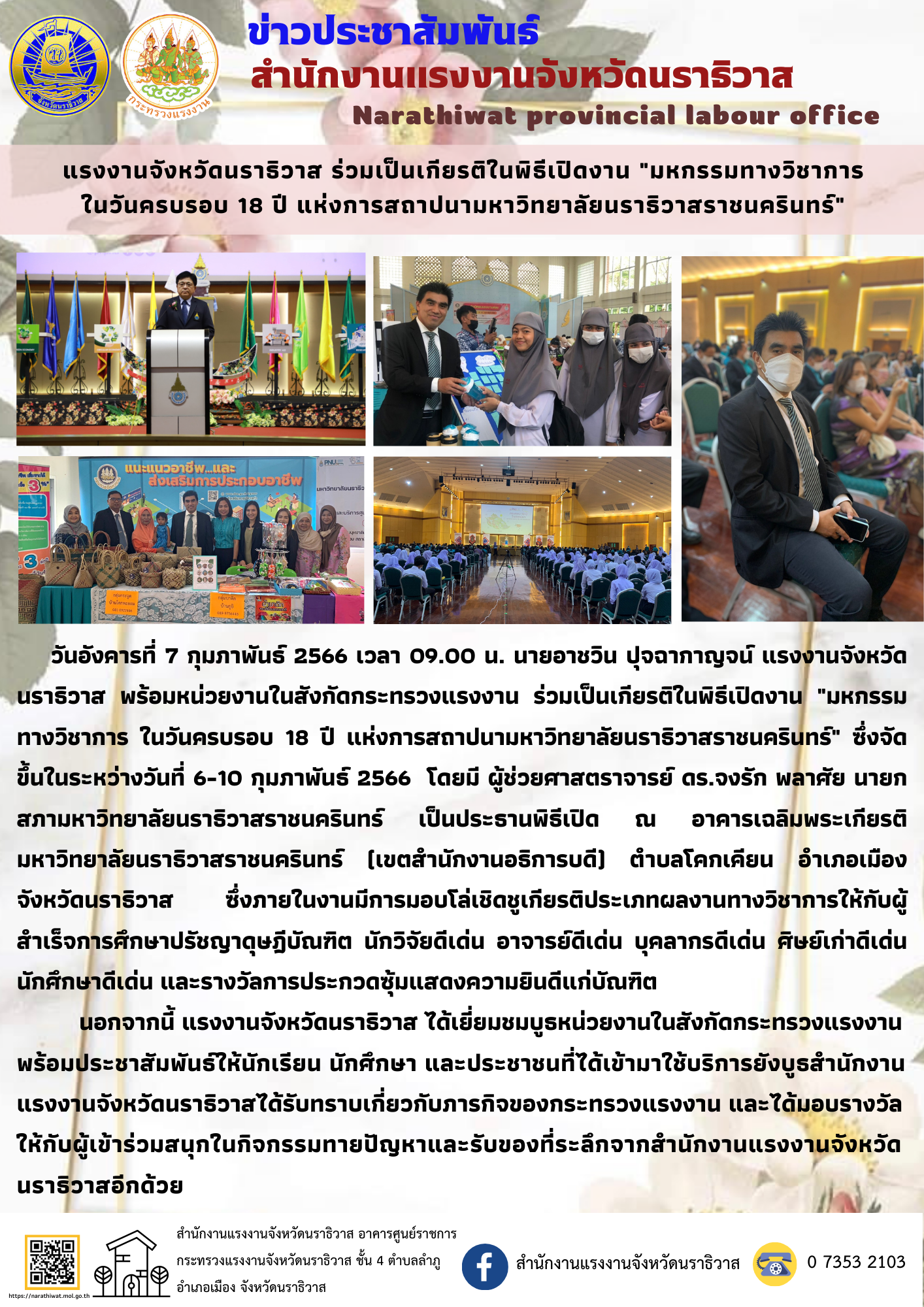 วันอังคารที่ 7 กุมภาพันธ์ 2566 เวลา 09.00 น. นายอาชวิน ปุจฉากาญจน์ แรงงานจังหวัดนราธิวาส พร้อมหน่วยงานในสังกัดกระทรวงแรงงาน ร่วมเป็นเกียรติในพิธีเปิดงาน “มหกรรมทางวิชาการ ในวันครบรอบ 18 ปี แห่งการสถาปนามหาวิทยาลัยนราธิวาสราชนครินทร์” ซึ่งจัดขึ้นในระหว่างวันที่ 6-10 กุมภาพันธ์ 2566 โดยมี ผู้ช่วยศาสตราจารย์ ดร.จงรัก พลาศัย นายกสภามหาวิทยาลัยนราธิวาสราชนครินทร์ เป็นประธานพิธีเปิด ณ อาคารเฉลิมพระเกียรติ มหาวิทยาลัยนราธิวาสราชนครินทร์ (เขตสำนักงานอธิการบดี) ตำบลโคกเคียน อำเภอเมืองจังหวัดนราธิวาส ซึ่งภายในงานมีการมอบโล่เชิดชูเกียรติประเภทผลงานทางวิชาการให้กับผู้สำเร็จการศึกษาปรัชญาดุษฎีบัณฑิต นักวิจัยดีเด่น อาจารย์ดีเด่น บุคลากรดีเด่น ศิษย์เก่าดีเด่น นักศึกษาดีเด่น และรางวัลการประกวดซุ้มแสดงความยินดีแก่บัณฑิต นอกจากนี้ แรงงานจังหวัดนราธิวาส ได้เยี่ยมชมบูธหน่วยงานในสังกัดกระทรวงแรงงานพร้อมประชาสัมพันธ์ให้นักเรียน นักศึกษา และประชาชนที่ได้เข้ามาใช้บริการยังบูธสำนักงานแรงงานจังหวัดนราธิวาสได้รับทราบเกี่ยวกับภารกิจของกระทรวงแรงงาน และได้มอบรางวัลให้กับผู้เข้าร่วมสนุกในกิจกรรมทายปัญหาและรับของที่ระลึกจากสำนักงานแรงงานจังหวัดนราธิวาสอีกด้วย