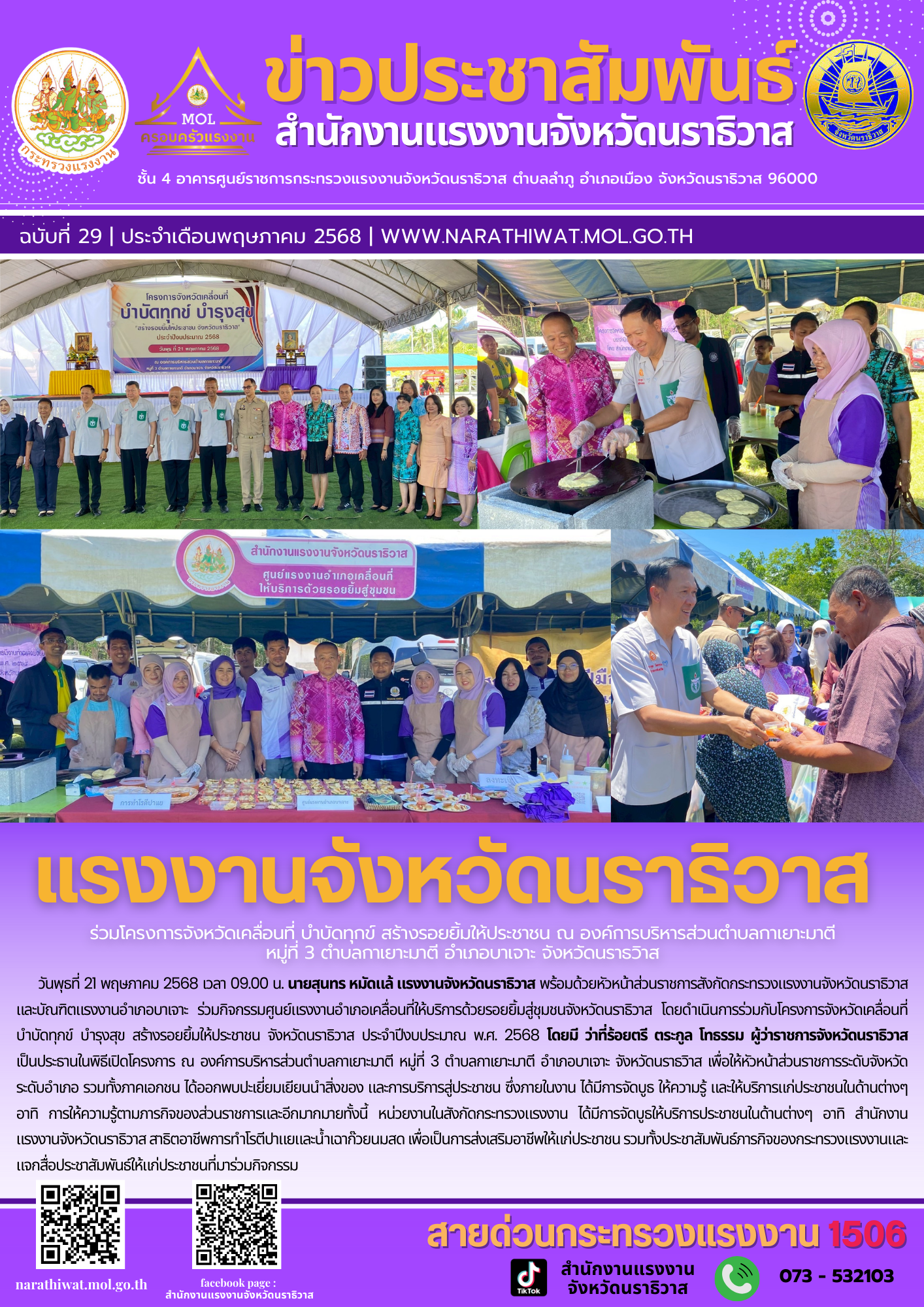 วันพุธที่ 21 พฤษภาคม 2568 เวลา 09.00 น. นายสุนทร หมัดแล้ แรงงานจังหวัดนราธิวาส พร้อมด้วยหัวหน้าส่วนราชการสังกัดกระทรวงแรงงานจังหวัดนราธิวาส และบัณฑิตแรงงานอำเภอบาเจาะ ร่วมกิจกรรมศูนย์แรงงานอำเภอเคลื่อนที่ให้บริการด้วยรอยยิ้มสู่ชุมชนจังหวัดนราธิวาส โดยดำเนินการร่วมกับโครงการจังหวัดเคลื่อนที่ บำบัดทุกข์ บำรุงสุข สร้างรอยยิ้มให้ประชาชน จังหวัดนราธิวาส ประจำปีงบประมาณ พ.ศ. 2568 โดยมี ว่าที่ร้อยตรี ตระกูล โทธรรม ผู้ว่าราชการจังหวัดนราธิวาส เป็นประธานในพิธีเปิดโครงการ ณ องค์การบริหารส่วนตำบลกาเยาะมาตี หมู่ที่ 3 ตำบลกาเยาะมาตี อำเภอบาเจาะ จังหวัดนราธวิาส เพื่อให้หัวหน้าส่วนราชการระดับจังหวัด ระดับอำเภอ รวมทั้งภาคเอกชน ได้ออกพบปะเยี่ยมเยียนนำสิ่งของ และการบริการสู่ประชาชน ซึ่งภายในงาน ได้มีการจัดบูธ ให้ความรู้ และให้บริการแก่ประชาชนในด้านต่างๆ อาทิ การให้ความรู้ตามภารกิจของส่วนราชการและอีกมากมายทั้งนี้ หน่วยงานในสังกัดกระทรวงแรงงาน ได้มีการจัดบูธให้บริการประชาชนในด้านต่างๆ อาทิ สำนักงานแรงงานจังหวัดนราธิวาส สาธิตอาชีพการทำโรตีปาแยและน้ำเฉาก๊วยนมสด เพื่อเป็นการส่งเสริมอาชีพให้แก่ประชาชน รวมทั้งประชาสัมพันธ์ภารกิจของกระทรวงแรงงานและแจกสื่อประชาสัมพันธ์ให้แก่ประชาชนที่มาร่วมกิจกรรม