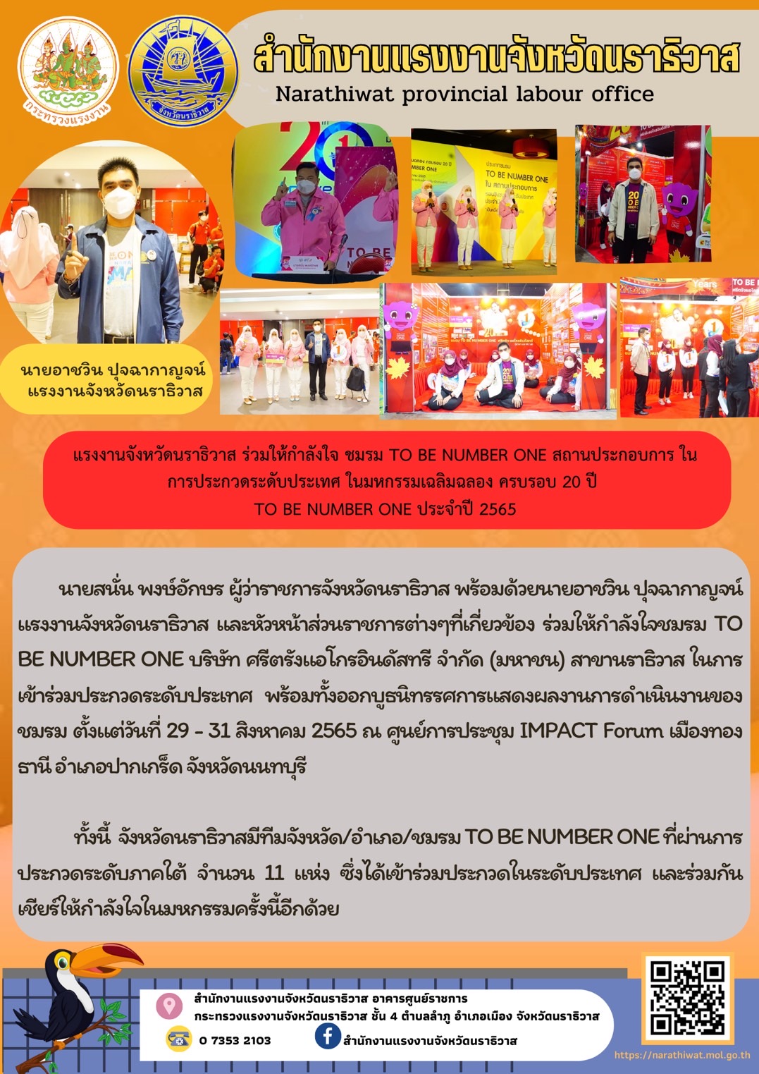 วันเสาร์ที่ 30 สิงหาคม 2565 จังหวัดนราธิวาส โดยนายสนั่น พงษ์อักษร ผู้ว่าราชการจังหวัดนราธิวาส พร้อมด้วยนายอาชวิน ปุจฉากาญจน์ แรงงานจังหวัดนราธิวาส และหัวหน้าส่วนราชการต่างๆที่เกี่ยวข้อง ร่วมให้กำลังใจชมรม TO BE NUMBER ONE บมจ.ศรีตรังแอโกรอินดัสทรี สาขานราธิวาส ในการเข้าร่วมประกวดระดับประเทศ พร้อมทั้งออกบูธนิทรรศการแสดงผลงานการดำเนินงานของชมรม ตั้งแต่วันที่ 29 – 31 สิงหาคม 2565 ณ ศูนย์การประชุม IMPACT Forum เมืองทองธานี อำเภอปากเกร็ด จังหวัดนนทบุรี ทั้งนี้ จังหวัดนราธิวาสมีทีมจังหวัด/อำเภอ/ชมรม TO BE NUMBER ONE ที่ผ่านการประกวดระดับภาคใต้ จำนวน 11 แห่ง ซึ่งได้เข้าร่วมประกวดในระดับประเทศ และร่วมกันเชียร์ให้กำลังใจในมหกรรมครั้งนี้อีกด้วย