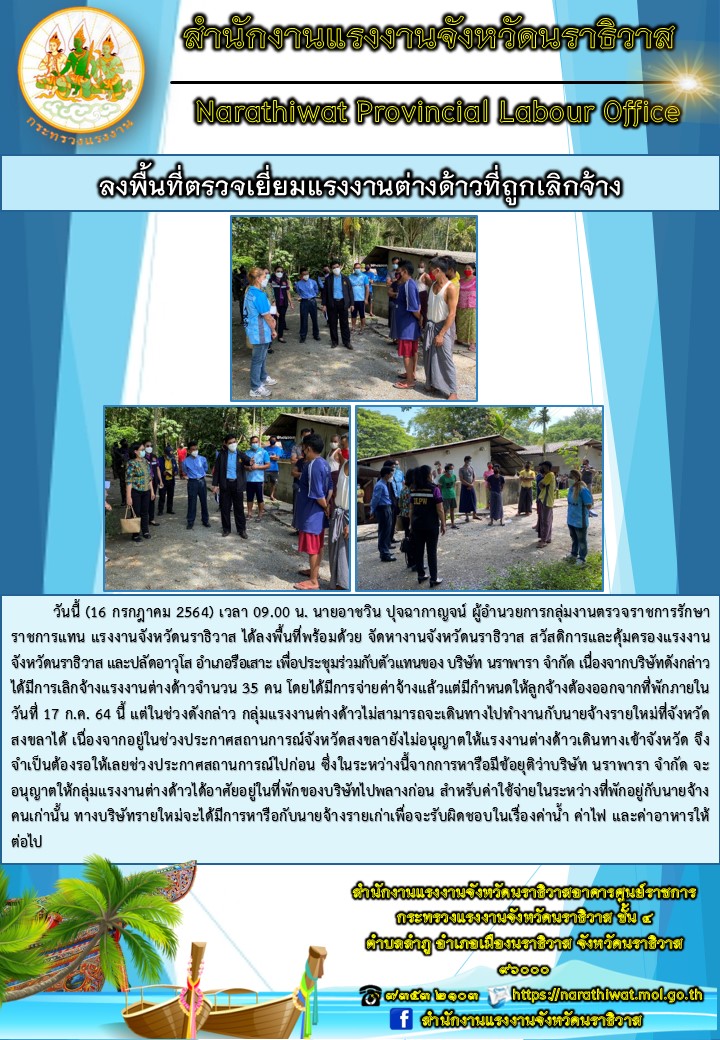วันนี้ (16 กรกฎาคม 2564) เวลา 09.00 น. นายอาชวิน ปุจฉากาญจน์ ผู้อำนวยการกลุ่มงานตรวจราชการรักษาราชการแทน แรงงานจังหวัดนราธิวาส ได้ลงพื้นที่พร้อมด้วย จัดหางานจังหวัดนราธิวาส สวัสดิการและคุ้มครองแรงงานจังหวัดนราธิวาส และปลัดอาสุโส อำเภอรือเสาะ เพื่อประชุมร่วมกับตัวแทนของ บริษัท นราพารา จำกัด เนื่องจากบริษัทดังกล่าวได้มีการเลิกจ้างแรงงานต่างด้าวจำนวน 35 คน โดยได้มีการจ่ายค่าจ้างแล้วแต่มีกำหนดให้ลูกจ้างต้องออกจากที่พักภายในวันที่ 17 ก.ค. 64 นี้ แต่ในช่วงดังกล่าว กลุ่มแรงงานต่างด้าวไม่สามารถจะเดินทางไปทำงานกับนายจ้างรายใหม่ที่จังหวัดสงขลาได้ เนื่องจากอยู่ในช่วงประกาศสถานการณ์จังหวัดสงขลายังไม่อนุญาตให้แรงงานต่างด้าวเดินทางเข้าจังหวัด จึงจำเป็นต้องรอให้เลยช่วงประกาศสถานการณ์ไปก่อน ซึ่งในระหว่างนี้จากการหารือมีข้อยุติว่าบริษัท นราพารา จำกัด จะอนุญาตให้กลุ่มแรงงานต่างด้าวได้อาศัยอยู่ในที่พักของบริษัทไปพลางก่อน สำหรับค่าใช้จ่ายในระหว่างที่พักอยู่กับนายจ้างคนเก่านั้น ทางบริษัทรายใหม่จะได้มีการหารือกับนายจ้างรายเก่าเพื่อจะรับผิดชอบในเรื่องค่าน้ำ ค่าไฟ และค่าอาหารให้ต่อไป
