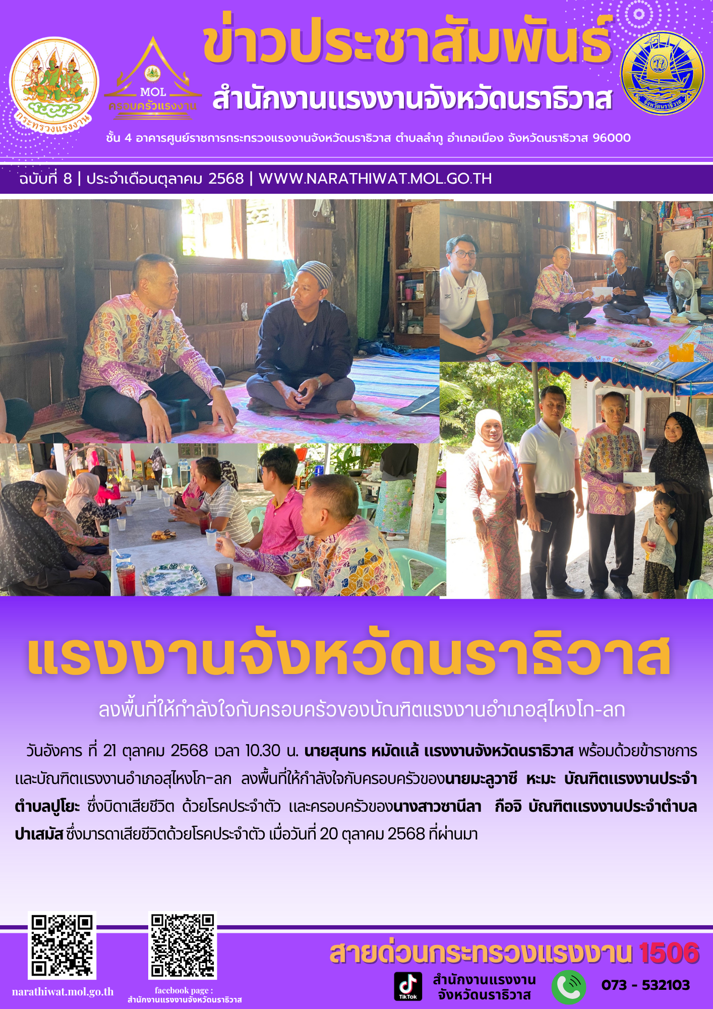 วันอังคาร ที่ 21 ตุลาคม 2568 เวลา 10.30 น. นายสุนทร หมัดแล้ แรงงานจังหวัดนราธิวาส พร้อมด้วยข้าราชการ และบัณฑิตแรงงานอำเภอสุไหงโก-ลก ลงพื้นที่ให้กำลังใจกับครอบครัวของนายมะลูวาซี หะมะ บัณฑิตแรงงานประจำตำบลปูโยะ ซึ่งบิดาเสียชีวิต ด้วยโรคประจำตัว และครอบครัวของนางสาวซานีลา กือจิ บัณฑิตแรงงานประจำตำบล ปาเสมัส ซึ่งมารดาเสียชีวิตด้วยโรคประจำตัว เมื่อวันที่ 20 ตุลาคม 2568 ที่ผ่านมา