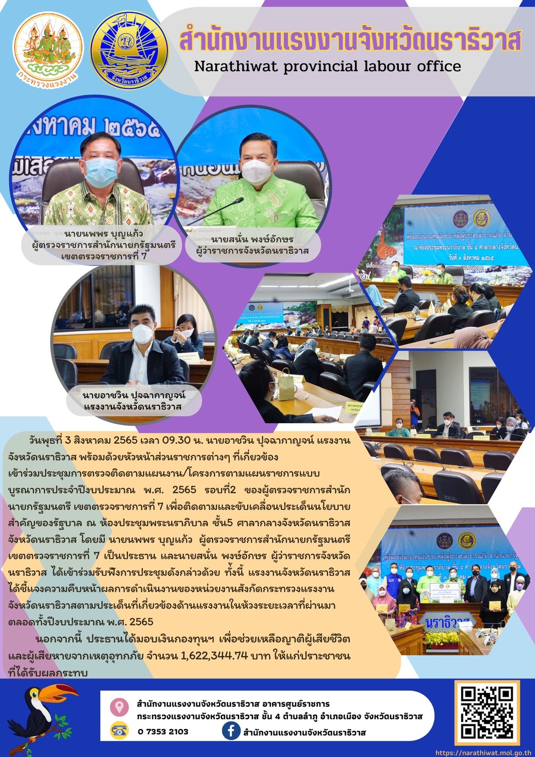 นพุธที่ 3 สิงหาคม 2565 เวลา 09.30 น. นายอาชวิน ปุจฉากาญจน์ แรงงานจังหวัดนราธิวาส พร้อมด้วยหัวหน้าส่วนราชการต่างๆ ที่เกี่ยวข้องเข้าร่วมประชุมการตรวจติดตามแผนงาน/โครงการตามแผนราชการแบบบูรณาการประจำปีงบประมาณ พ.ศ. 2565 รอบที่2 ของผู้ตรวจราชการสำนักนายกรัฐมนตรี เขตตรวจราชการที่ 7 เพื่อติดตามและขับเคลื่อนประเด็นนโยบายสำคัญของรัฐบาล ณ ห้องประชุมพระนราภิบาล ชั้น5 ศาลากลางจังหวัดนราธิวาส จังหวัดนราธิวาส โดยมี นายนพพร บุญแก้ว ผู้ตรวจราชการสำนักนายกรัฐมนตรี เขตตรวจราชการที่ 7 เป็นประธาน และนายสนั่น พงษ์อักษร ผู้ว่าราชการจังหวัดนราธิวาส ได้เข้าร่วมรับฟัังการประชุมดังกล่าวด้วย ทั่้งนี้ แรงงานจังหวัดนราธิวาสได้ชี้แจงความคืบหน้าผลการดำเนินงานของหน่วยงานสังกัดกระทรวงแรงงานจังหวัดนราธิวาสตามประเด็นที่เกี่ยวข้องด้านแรงงานในห้วงระยะเวลาที่ผ่านมาตลอดทั้งปีงบประมาณ พ.ศ. 2565
