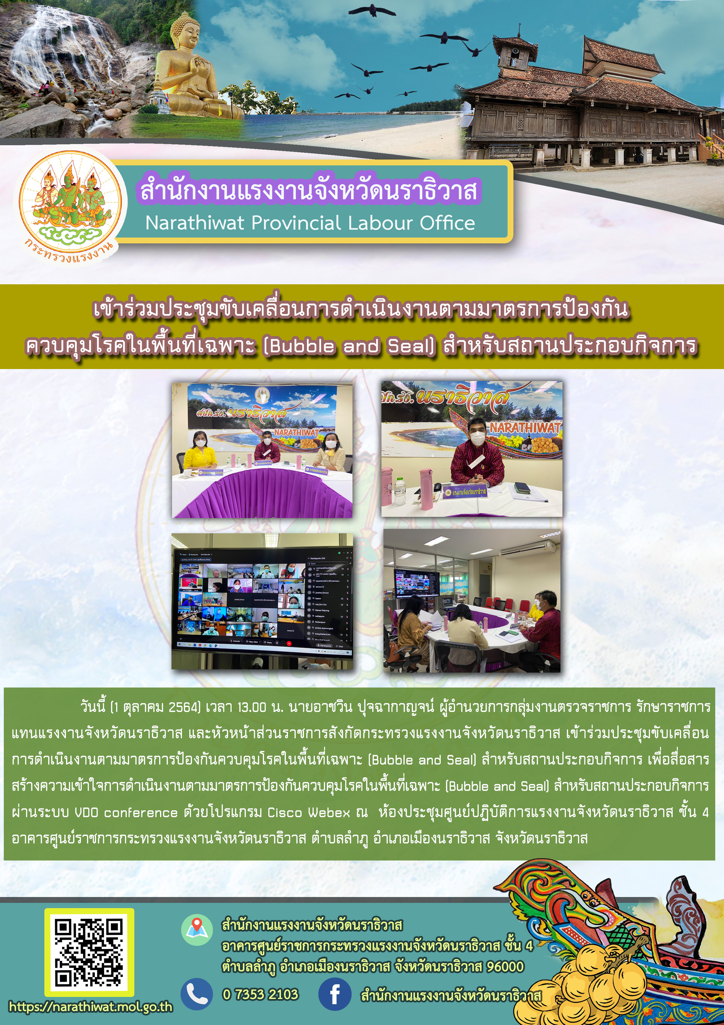วันนี้ (1 ตุลาคม 2564) เวลา 13.00 น. นายอาชวิน ปุจฉากาญจน์ ผู้อำนวยการกลุ่มงานตรวจราชการ รักษาราชการ แทนแรงงานจังหวัดนราธิวาส และหัวหน้าส่วนราชการสังกัดกระทรวงแรงงานจังหวัดนราธิวาส เข้าร่วมประชุมขับเคลื่อน การดำเนินงานตามมาตรการป้องกันควบคุมโรคในพื้นที่เฉพาะ (Bubble and Seal) สำหรับสถานประกอบกิจการ เพื่อสื่อสารสร้างความเข้าใจการดำเนินงานตามมาตรการป้องกันควบคุมโรคในพื้นที่เฉพาะ (Bubble and Seal) สำหรับสถานประกอบกิจการ ผ่านระบบ VDO conference ด้วยโปรแกรม Cisco Webex ณ ห้องประชุมศูนย์ปฏิบัติการแรงงานจังหวัดนราธิวาส ชั้น 4 อาคารศูนย์ราชการกระทรวงแรงงานจังหวัดนราธิวาส ตำบลลำภู อำเภอเมืองนราธิวาส จังหวัดนราธิวาส