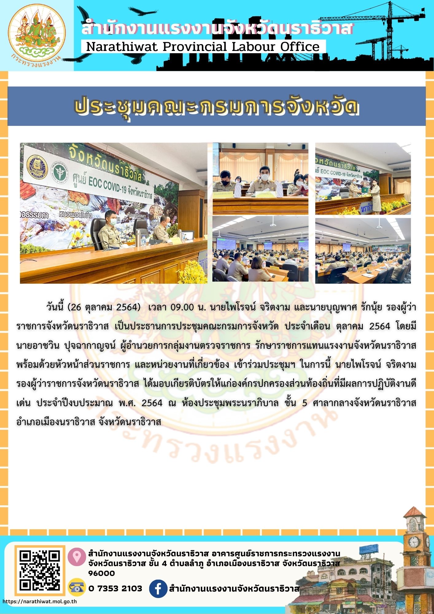 วันนี้ (26 ตุลาคม 2564) เวลา 09.00 น. นายไพโรจน์ จริตงาม และนายบุญพาศ รักนุ้ย รองผู้ว่าราชการจังหวัดนราธิวาส เป็นประธานการประชุมคณะกรมการจังหวัด ประจำเดือน ตุลาคม 2564 โดยมี นายอาชวิน ปุจฉากาญจน์ ผู้อำนวยการกลุ่มงานตรวจราชการ รักษาราชการแทนแรงงานจังหวัดนราธิวาส พร้อมด้วยหัวหน้าส่วนราชการ และหน่วยงานที่เกี่ยวข้อง เข้าร่วมประชุมฯ ในการนี้ นายไพโรจน์ จริตงาม รองผู้ว่าราชการจังหวัดนราธิวาส ได้มอบเกียรติบัตรให้แก่องค์กรปกครองส่วนท้องถิ่นที่มีผลการปฏิบัติงานดีเด่น ประจำปีงบประมาณ พ.ศ. 2564 ณ ห้องประชุมพระนราภิบาล ชั้น 5 ศาลากลางจังหวัดนราธิวาส อำเภอเมืองนราธิวาส จังหวัดนราธิวาส