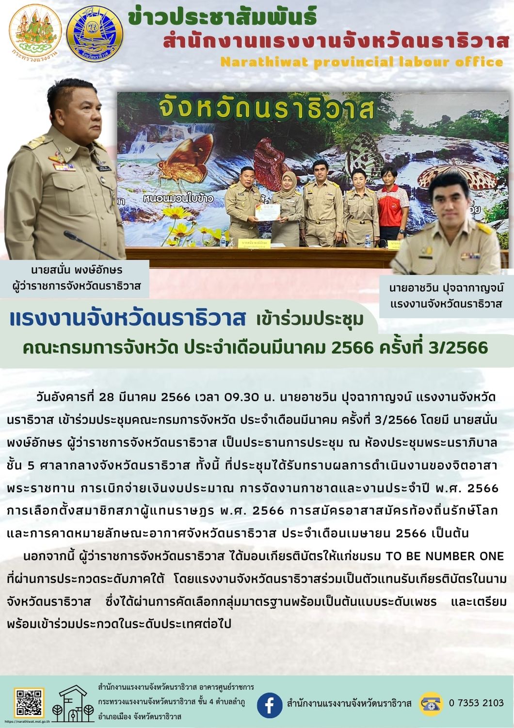 วันอังคารที่ 28 มีนาคม 2566 เวลา 09.30 น. นายอาชวิน ปุจฉากาญจน์ แรงงานจังหวัดนราธิวาส เข้าร่วมประชุมคณะกรมการจังหวัด ประจำเดือนมีนาคม ครั้งที่ 3/2566 โดยมี นายสนั่น พงษ์อักษร ผู้ว่าราชการจังหวัดนราธิวาส เป็นประธานการประชุม ณ ห้องประชุมพระนราภิบาล ชั้น 5 ศาลากลางจังหวัดนราธิวาส ทั้งนี้ ที่ประชุมได้รับทราบผลการดำเนินงานของจิตอาสาพระราชทาน การเบิกจ่ายเงินงบประมาณ การจัดงานกาชาดและงานประจำปี พ.ศ. 2566 การเลือกตั้งสมาชิกสภาผู้แทนราษฎร พ.ศ. 2566 การสมัครอาสาสมัครท้องถิ่นรักษ์โลก และการคาดหมายลักษณะอากาศจังหวัดนราธิวาส ประจำเดือนเมษายน 2566 เป็นต้น นอกจากนี้ ผู้ว่าราชการจังหวัดนราธิวาส ได้มอบเกียรติบัตรให้แก่ชมรม TO BE NUMBER ONE ที่ผ่านการประกวดระดับภาคใต้ โดยแรงงานจังหวัดนราธิวาสร่วมเป็นตัวแทนรับเกียรติบัตรในนามจังหวัดนราธิวาส ซึ่งได้ผ่านการคัดเลือกกลุ่มมาตรฐานพร้อมเป็นต้นแบบระดับเพชร และเตรียมพร้อมเข้าร่วมประกวดในระดับประเทศต่อไป