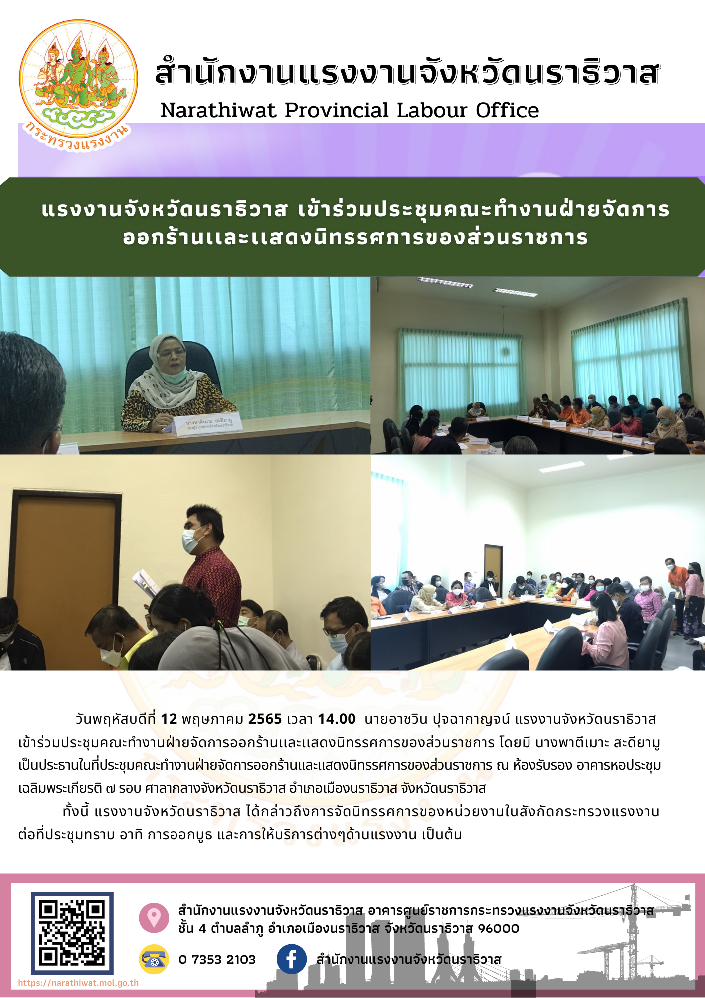 วันพฤหัสบดีที่ 12 พฤษภาคม 2565 เวลา 14.00 นายอาชวิน ปุจฉากาญจน์ แรงงานจังหวัดนราธิวาส เข้าร่วมประชุมคณะทำงานฝ่ายจัดการออกร้านเเละเเสดงนิทรรศการของส่วนราชการ โดยมี นางพาตีเมาะ สะดียามู เป็นประธานในที่ประชุมคณะทำงานฝ่ายจัดการออกร้านเเละเเสดงนิทรรศการของส่วนราชการ ณ ห้องรับรอง อาคารหอประชุมเฉลิมพระเกียรติ ๗ รอบ ศาลากลางจังหวัดนราธิวาส อำเภอเมืองนราธิวาส จังหวัดนราธิวาส ทั้งนี้ แรงงานจังหวัดนราธิวาส ได้กล่าวถึงการจัดนิทรรศการของหน่วยงานในสังกัดกระทรวงแรงงานต่อที่ประชุมทราบ อาทิ การออกบูธ และการให้บริการต่างๆด้านแรงงาน เป็นต้น
