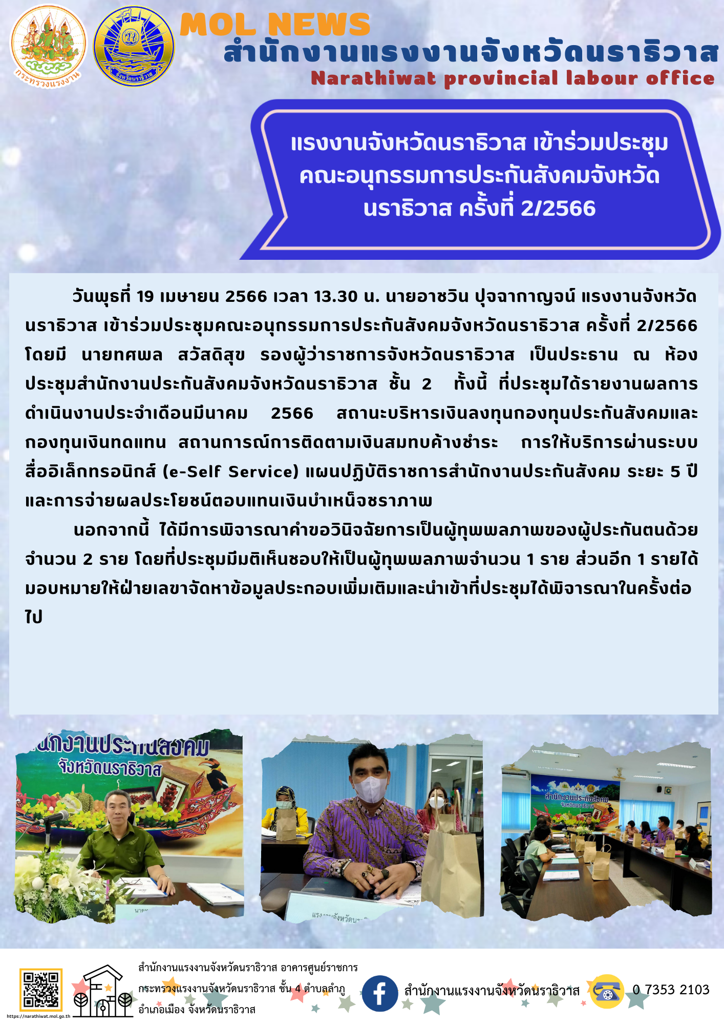 วันพุธที่ 19 เมษายน 2566 เวลา 13.30 น. นายอาชวิน ปุจฉากาญจน์ แรงงานจังหวัดนราธิวาส เข้าร่วมประชุมคณะอนุกรรมการประกันสังคมจังหวัดนราธิวาส ครั้งที่ 2/2566 โดยมี นายทศพล สวัสดิสุข รองผู้ว่าราชการจังหวัดนราธิวาส เป็นประธาน ณ ห้องประชุมสำนักงานประกันสังคมจังหวัดนราธิวาส ชั้น 2 ทั้งนี้ ที่ประชุมได้รายงานผลการดำเนินงานประจำเดือนมีนาคม 2566 สถานะบริหารเงินลงทุนกองทุนประกันสังคมและกองทุนเงินทดแทน สถานการณ์การติดตามเงินสมทบค้างชำระ การให้บริการผ่านระบบสื่ออิเล็กทรอนิกส์ (e-Self Service) แผนปฏิบัติราชการสำนักงานประกันสังคม ระยะ 5 ปี และการจ่ายผลประโยชน์ตอบแทนเงินบำเหน็จชราภาพ นอกจากนี้ ได้มีการพิจารณาคำขอวินิจฉัยการเป็นผู้ทุพพลภาพของผู้ประกันตนด้วยจำนวน 2 ราย โดยที่ประชุมมีมติเห็นชอบให้เป็นผู้ทุพพลภาพจำนวน 1 ราย ส่วนอีก 1 รายได้มอบหมายให้ฝ่ายเลขาจัดหาข้อมูลประกอบเพิ่มเติมและนำเข้าที่ประชุมได้พิจารณาในครั้งต่อไป