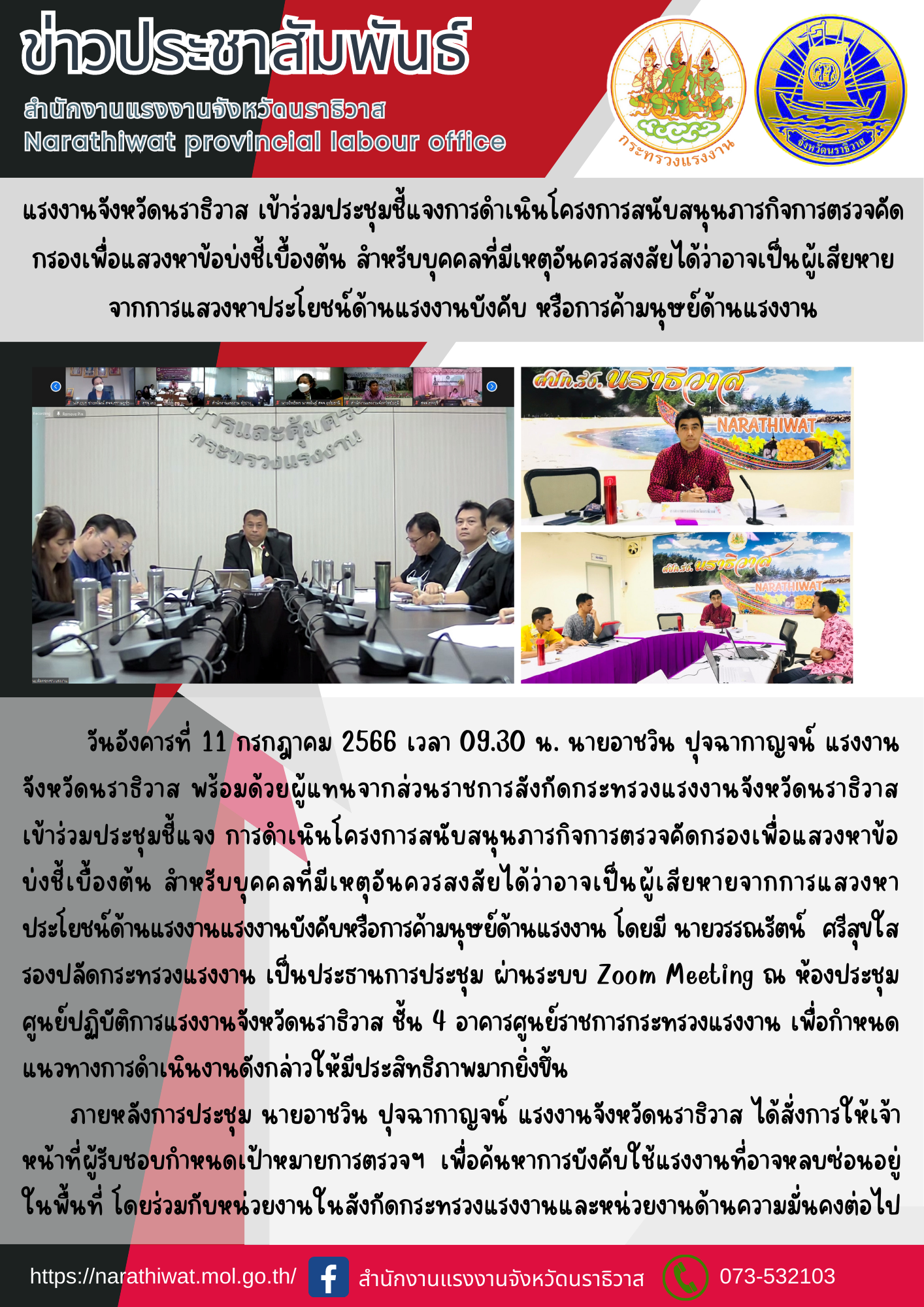 วันอังคารที่ 11 กรกฎาคม 2566 เวลา 09.30 น. นายอาชวิน ปุจฉากาญจน์ แรงงานจังหวัดนราธิวาส พร้อมด้วยผู้แทนจากส่วนราชการสังกัดกระทรวงแรงงานจังหวัดนราธิวาส เข้าร่วมประชุมชี้แจง การดำเนินโครงการสนับสนุนภารกิจการตรวจคัดกรองเพื่อแสวงหาข้อบ่งชี้เบื้องต้น สำหรับบุคคลที่มีเหตุอันควรสงสัยได้ว่าอาจเป็นผู้เสียหายจากการแสวงหาประโยชน์ด้านแรงงานแรงงานบังคับหรือการค้ามนุษย์ด้านแรงงาน โดยมี นายวรรณรัตน์ ศรีสุขใส รองปลัดกระทรวงแรงงาน เป็นประธานการประชุม ผ่านระบบ Zoom Meeting ณ ห้องประชุมศูนย์ปฏิบัติการแรงงานจังหวัดนราธิวาส ชั้น 4 อาคารศูนย์ราชการกระทรวงแรงงาน เพื่อกำหนดแนวทางการดำเนินงานดังกล่าวให้มีประสิทธิภาพมากยิ่งขึ้น ภายหลังการประชุม นายอาชวิน ปุจฉากาญจน์ แรงงานจังหวัดนราธิวาส ได้สั่งการให้เจ้าหน้าที่ผู้รับชอบกำหนดเป้าหมายการตรวจฯ เพื่อค้นหาการบังคับใช้แรงงานที่อาจหลบซ่อนอยู่ในพื้นที่ โดยร่วมกับหน่วยงานในสังกัดกระทรวงแรงงานและหน่วยงานด้านความมั่นคงต่อไป