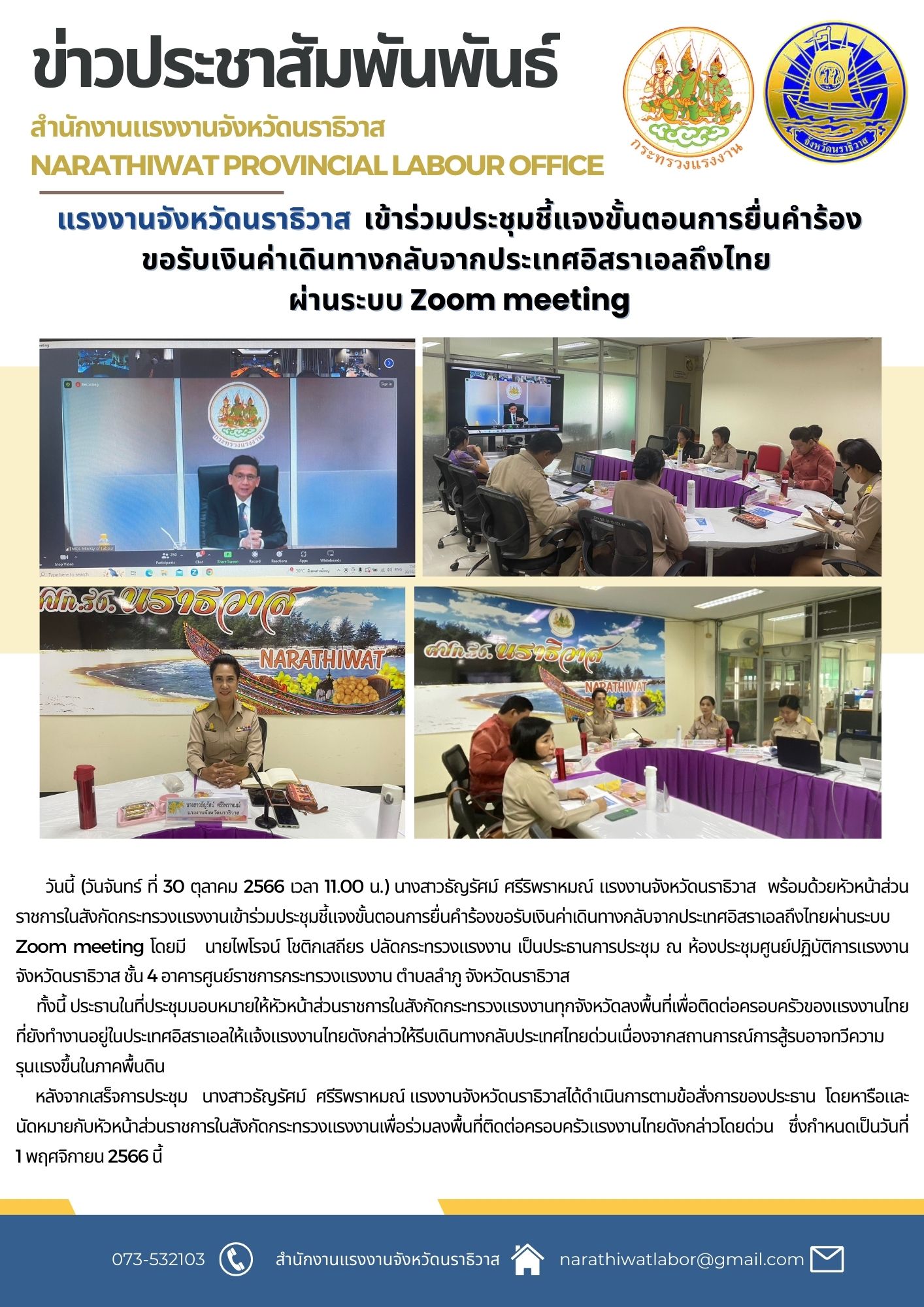 วันนี้ (วันจันทร์ ที่ 30 ตุลาคม 2566 เวลา 11.00 น.) นางสาวธัญรัศม์ ศรีริพราหมณ์ แรงงานจังหวัดนราธิวาส พร้อมด้วยหัวหน้าส่วนราชการในสังกัดกระทรวงแรงงานเข้าร่วมประชุมชี้แจงขั้นตอนการยื่นคำร้องขอรับเงินค่าเดินทางกลับจากประเทศอิสราเอลถึงไทยผ่านระบบ Zoom meeting โดยมี นายไพโรจน์ โชติกเสถียร ปลัดกระทรวงแรงงาน เป็นประธานการประชุม ณ ห้องประชุมศูนย์ปฏิบัติการแรงงานจังหวัดนราธิวาส ชั้น 4 อาคารศูนย์ราชการกระทรวงแรงงาน ตำบลลำภู จังหวัดนราธิวาส ทั้งนี้ ประธานในที่ประชุมมอบหมายให้หัวหน้าส่วนราชการในสังกัดกระทรวงแรงงานทุกจังหวัดลงพื้นที่เพื่อติดต่อครอบครัวของแรงงานไทยที่ยังทำงานอยู่ในประเทศอิสราเอลให้แจ้งแรงงานไทยดังกล่าวให้รีบเดินทางกลับประเทศไทยด่วน เนื่องจากสถานการณ์การสู้รบอาจทวีความรุนแรงขึ้นในภาคพื้นดิน หลังจากเสร็จการประชุม นางสาวธัญรัศม์ ศรีริพราหมณ์ แรงงานจังหวัดนราธิวาสได้ดำเนินการตามข้อสั่งการของประธาน โดยหารือและนัดหมายกับหัวหน้าส่วนราชการในสังกัดกระทรวงแรงงานเพื่อร่วมลงพื้นที่ติดต่อครอบครัวแรงงานไทยดังกล่าวโดยด่วน ซึ่งกำหนดเป็นวันที่ 1 พฤศจิกายน 2566 นี้