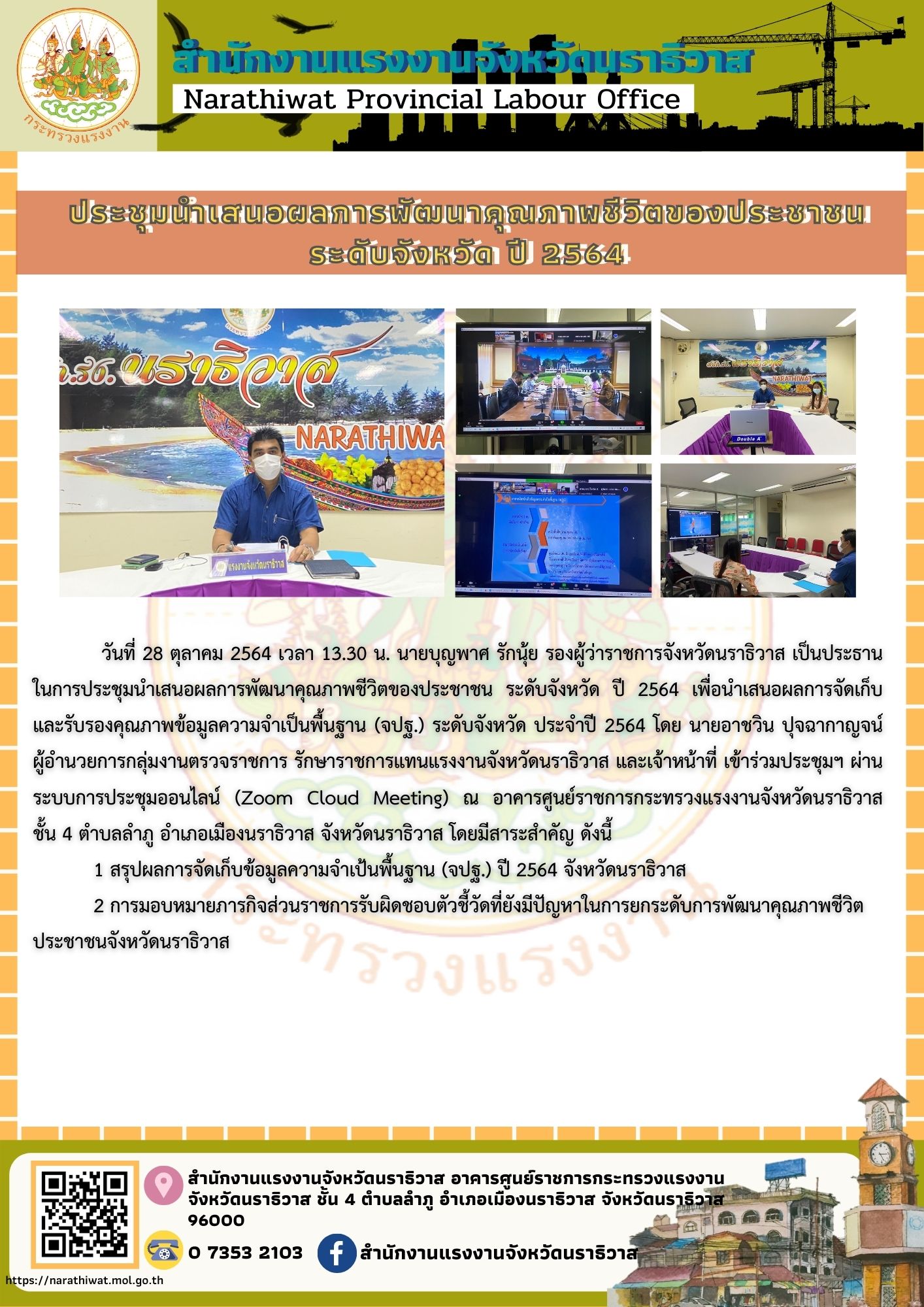 วันที่ 28 ตุลาคม 2564 เวลา 13.30 น. นายบุญพาศ รักนุ้ย รองผู้ว่าราชการจังหวัดนราธิวาส เป็นประธานในการประชุมนำเสนอผลการพัฒนาคุณภาพชีวิตของประชาชน ระดับจังหวัด ปี 2564 เพื่อนำเสนอผลการจัดเก็บและรับรองคุณภาพข้อมูลความจำเป็นพื้นฐาน (จปฐ.) ระดับจังหวัด ประจำปี 2564 โดย นายอาชวิน ปุจฉากาญจน์ ผู้อำนวยการกลุ่มงานตรวจราชการ รักษาราชการแทนแรงงานจังหวัดนราธิวาส และเจ้าหน้าที่ เข้าร่วมประชุมฯ ผ่านระบบการประชุมออนไลน์ (Zoom Cloud Meeting) ณ อาคารศูนย์ราชการกระทรวงแรงงานจังหวัดนราธิวาส ชั้น 4 ตำบลลำภู อำเภอเมืองนราธิวาส จังหวัดนราธิวาส โดยมีสาระสำคัญ ดังนี้