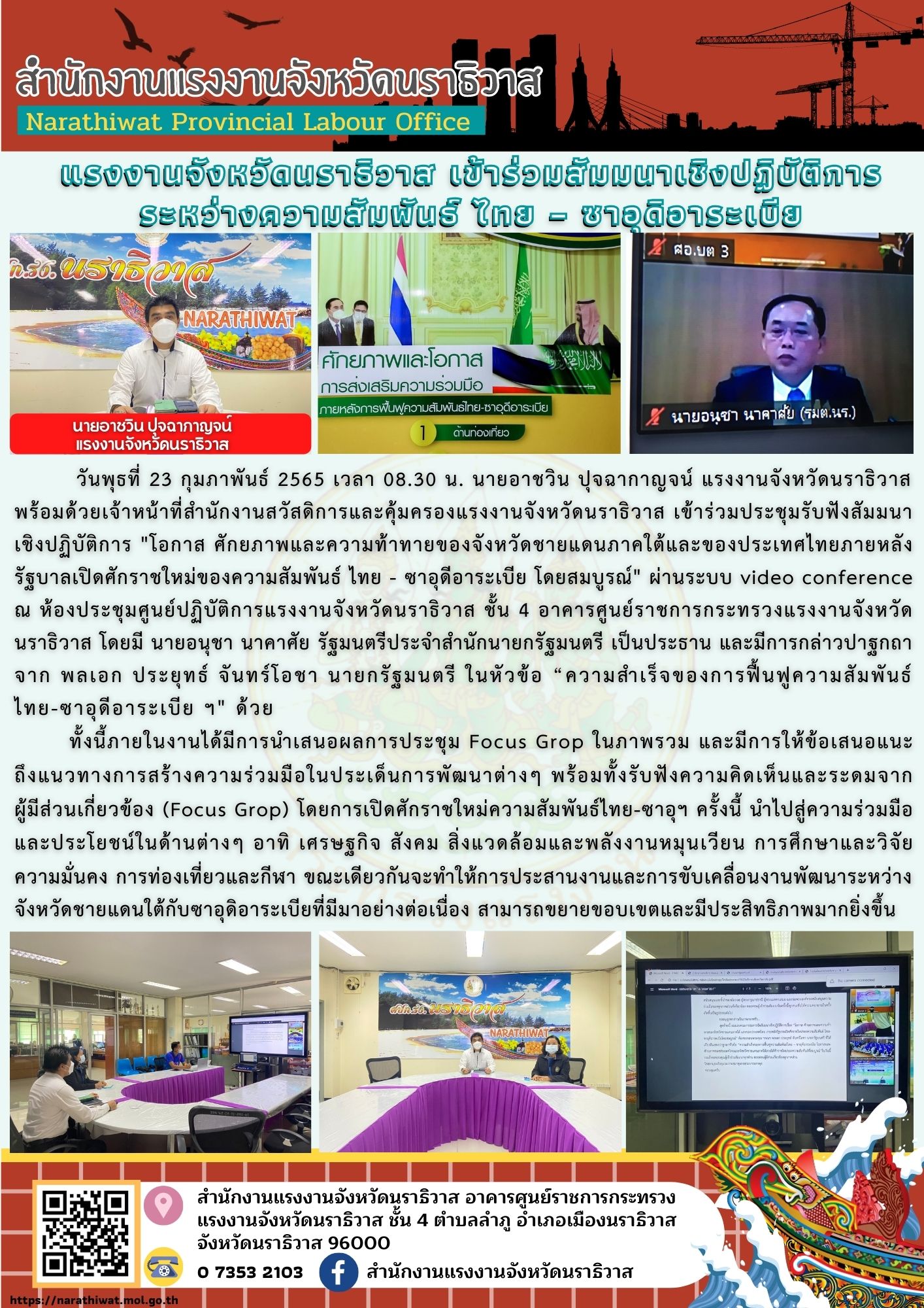 วันพุธที่ 23 กุมภาพันธ์ 2565 เวลา 08.30 น. นายอาชวิน ปุจฉากาญจน์ แรงงานจังหวัดนราธิวาส พร้อมด้วยเจ้าหน้าที่สำนักงานสวัสดิการและคุ้มครองแรงงานจังหวัดนราธิวาส เข้าร่วมประชุมรับฟังสัมมนาเชิงปฏิบัติการ “โอกาส ศักยภาพและความท้าทายของจังหวัดชายแดนภาคใต้และของประเทศไทยภายหลังรัฐบาลเปิดศักราชใหม่ของความสัมพันธ์ ไทย – ซาอุดีอาระเบีย โดยสมบูรณ์” ผ่านระบบ video conference ณ ห้องประชุมศูนย์ปฏิบัติการแรงงานจังหวัดนราธิวาส ชั้น 4 อาคารศูนย์ราชการกระทรวงแรงงานจังหวัดนราธิวาส โดยมี นายอนุชา นาคาศัย รัฐมนตรีประจำสำนักนายกรัฐมนตรี เป็นประธาน และมีการกล่าวปาฐกถาจาก พลเอก ประยุทธ์ จันทร์โอชา นายกรัฐมนตรี ในหัวข้อ “ความสำเร็จของการฟื้นฟูความสัมพันธ์ ไทย-ซาอุดีอาระเบีย ฯ” ด้วย
