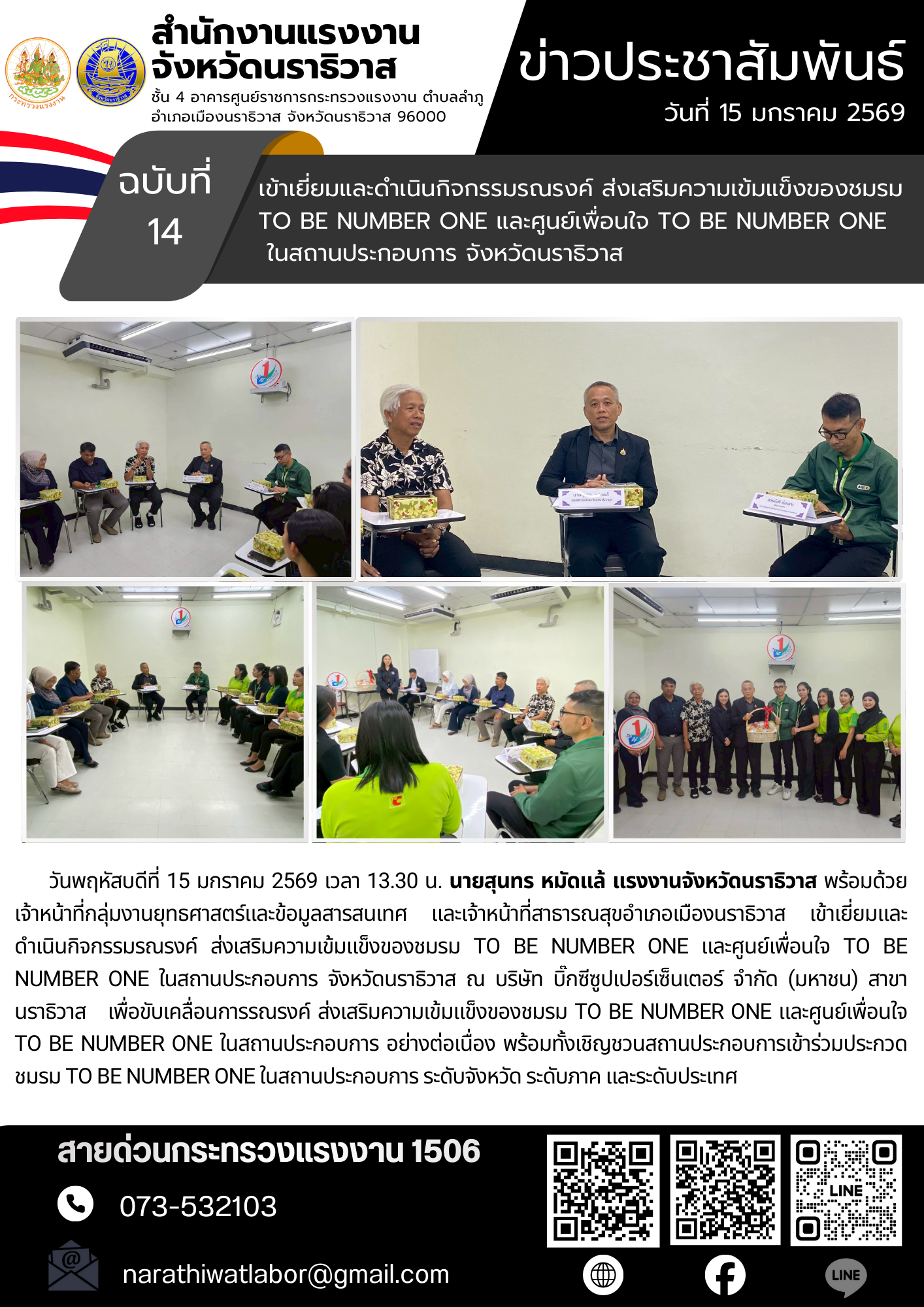 วันพฤหัสบดีที่ 15 มกราคม 2569 เวลา 13.30 น. นายสุนทร หมัดแล้ แรงงานจังหวัดนราธิวาส พร้อมด้วย เจ้าหน้าที่กลุ่มงานยุทธศาสตร์และข้อมูลสารสนเทศ และเจ้าหน้าที่สาธารณสุขอำเภอเมืองนราธิวาส เข้าเยี่ยมและดำเนินกิจกรรมรณรงค์ ส่งเสริมความเข้มแข็งของชมรม TO BE NUMBER ONE และศูนย์เพื่อนใจ TO BE NUMBER ONE ในสถานประกอบการ จังหวัดนราธิวาส ณ บริษัท บิ๊กซีซูปเปอร์เซ็นเตอร์ จำกัด (มหาชน) สาขานราธิวาส เพื่อขับเคลื่อนการรณรงค์ ส่งเสริมความเข้มแข็งของชมรม TO BE NUMBER ONE และศูนย์เพื่อนใจ TO BE NUMBER ONE ในสถานประกอบการ อย่างต่อเนื่อง พร้อมทั้งเชิญชวนสถานประกอบการเข้าร่วมประกวดชมรม TO BE NUMBER ONE ในสถานประกอบการ ระดับจังหวัด ระดับภาค และระดับประเทศ