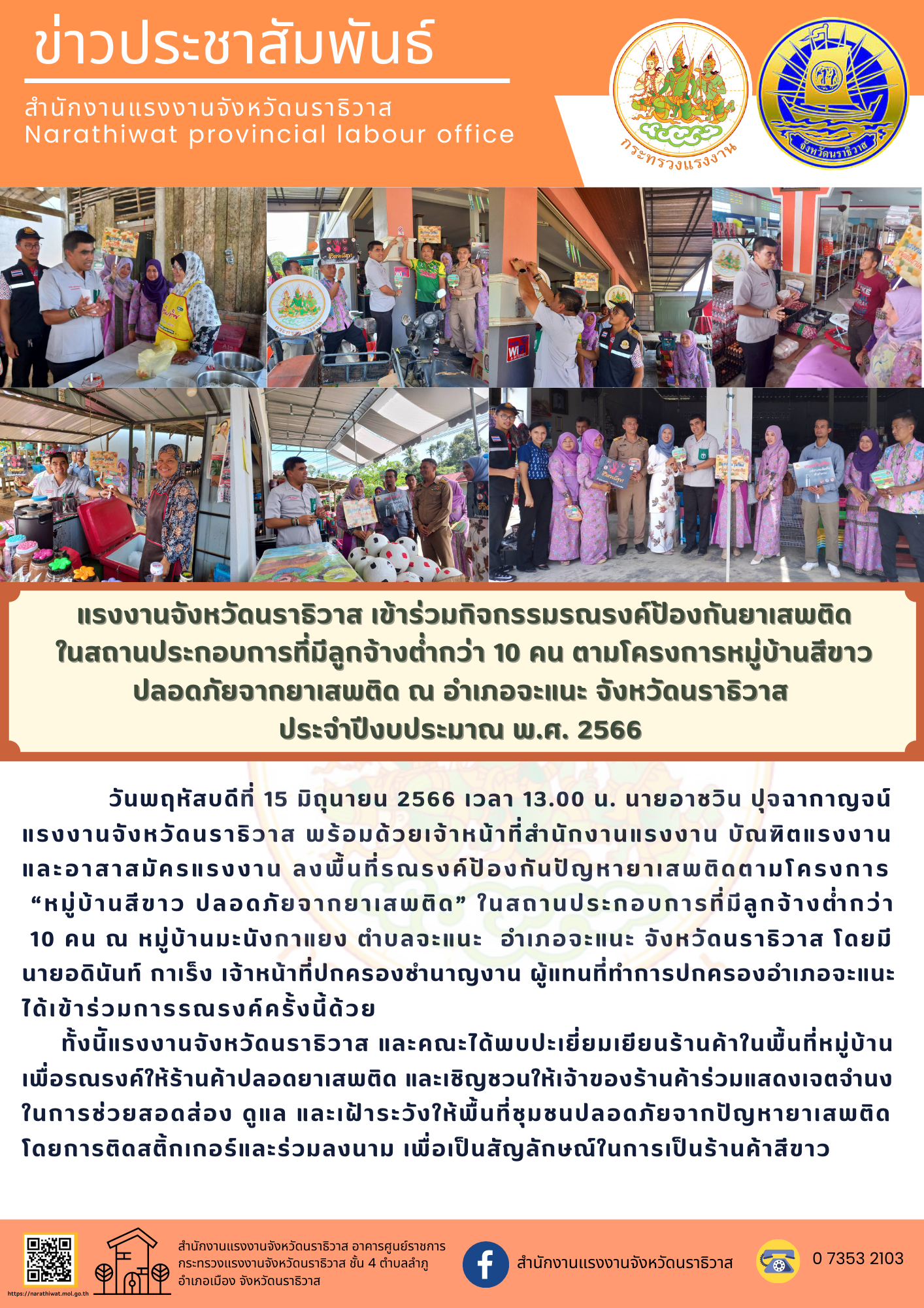 วันพฤหัสบดีที่ 15 มิถุนายน 2566 เวลา 13.00 น. นายอาชวิน ปุจฉากาญจน์ แรงงานจังหวัดนราธิวาส พร้อมด้วยเจ้าหน้าที่สำนักงานแรงงาน บัณฑิตแรงงานและอาสาสมัครแรงงาน ลงพื้นที่รณรงค์ป้องกันปัญหายาเสพติดตามโครงการ “หมู่บ้านสีขาว ปลอดภัยจากยาเสพติด” ในสถานประกอบการที่มีลูกจ้างต่ำกว่า 10 คน ณ หมู่บ้านมะนังกาแยง ตำบลจะแนะ อำเภอจะแนะ จังหวัดนราธิวาส โดยมี นายอดินันท์ กาเร็ง เจ้าหน้าที่ปกครองชำนาญงาน ผู้แทนที่ทำการปกครองอำเภอจะแนะได้เข้าร่วมการรณรงค์ครั้งนี้ด้วย ทั้งนีัแรงงานจังหวัดนราธิวาส และคณะได้พบปะเยี่ยมเยียนร้านค้าในพื้นที่หมู่บ้านเพื่อรณรงค์ให้ร้านค้าปลอดยาเสพติด และเชิญชวนให้เจ้าของร้านค้าร่วมแสดงเจตจำนงในการช่วยสอดส่อง ดูแล และเฝ้าระวังให้พื้นที่ชุมชนปลอดภัยจากปัญหายาเสพติดโดยการติดสติ้กเกอร์และร่วมลงนาม เพื่อเป็นสัญลักษณ์ในการเป็นร้านค้าสีขาว
