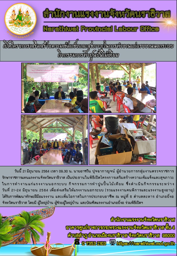 วันนี้ 21 มิถุนายน 2564 เวลา 09.30 น. นายอาชวิน ปุจฉากาญจน์ ผู้อำนวยการกลุ่มงานตรวจราชการรักษาราชการแทนแรงงานจังหวัดนราธิวาส เป็นประธานในพิธีเปิดโครงการเสริมสร้างความเข้มแข็งและสุขภาวะในการทำงานแก่แรงงานนอกระบบ กิจกรรมการทำปูนปั้นไม้เทียม ซึ่งดำเนินกิจกรรมระหว่างวันที่ 21–24 มิถุนายน 2564 เพื่อส่งเสริมให้แรงงานนอกระบบ (รวมแรงงานคนพิการและแรงงานสูงอายุ) ได้รับการพัฒนาทักษะฝีมือแรงงาน และเพิ่มโอกาสในการประกอบอาชีพ ณ หมู่ที่ 6 ตำบลละหาร อำเภอยี่งอจังหวัดนราธิวาส โดยมี ผู้ใหญ่บ้าน ผู้ช่วยผู้ใหญ่บ้าน และบัณฑิตแรงงานอำเภอยี่งอ ร่วมพิธีเปิดฯ