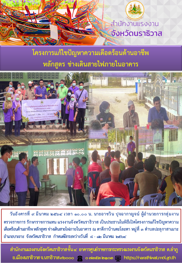 แรงงานจังหวัดนราธิวาส เปิดโครงการแก้ไขปัญหาความเดือดร้อนด้านอาชีพ หลักสูตร ช่างเดินสายไฟภายในอาคาร
