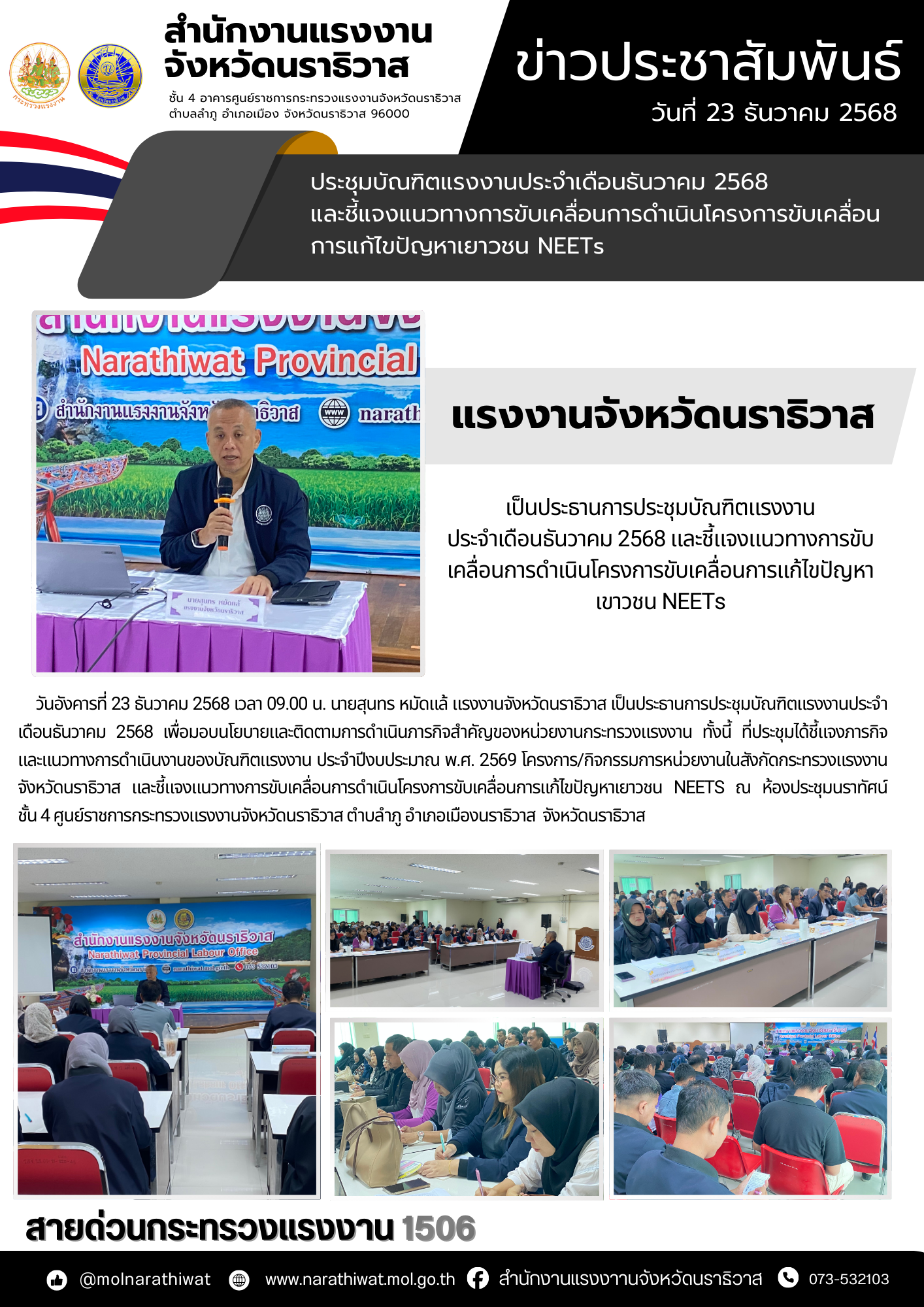 วันอังคารที่ 23 ธันวาคม 2568 เวลา 09.00 น. นายสุนทร หมัดแล้ แรงงานจังหวัดนราธิวาส เป็นประธานการประชุมบัณฑิตแรงงานประจำเดือนธันวาคม 2568 เพื่อมอบนโยบายและติดตามการดำเนินภารกิจสำคัญของหน่วยงานกระทรวงแรงงาน ทั้งนี้ ที่ประชุมได้ชี้แจงภารกิจ และแนวทางการดำเนินงานของบัณฑิตแรงงาน ประจำปีงบประมาณ พ.ศ. 2569 โครงการ/กิจกรรมการหน่วยงานในสังกัดกระทรวงแรงงานจังหวัดนราธิวาส และชี้แจงแนวทางการขับเคลื่อนการดำเนินโครงการขับเคลื่อนการแก้ไขปัญหาเยาวชน NEETs ณ ห้องประชุมนราทัศน์ ชั้น 4 ศูนย์ราชการกระทรวงแรงงานจังหวัดนราธิวาส ตำบลำภู อำเภอเมืองนราธิวาส จังหวัดนราธิวาส