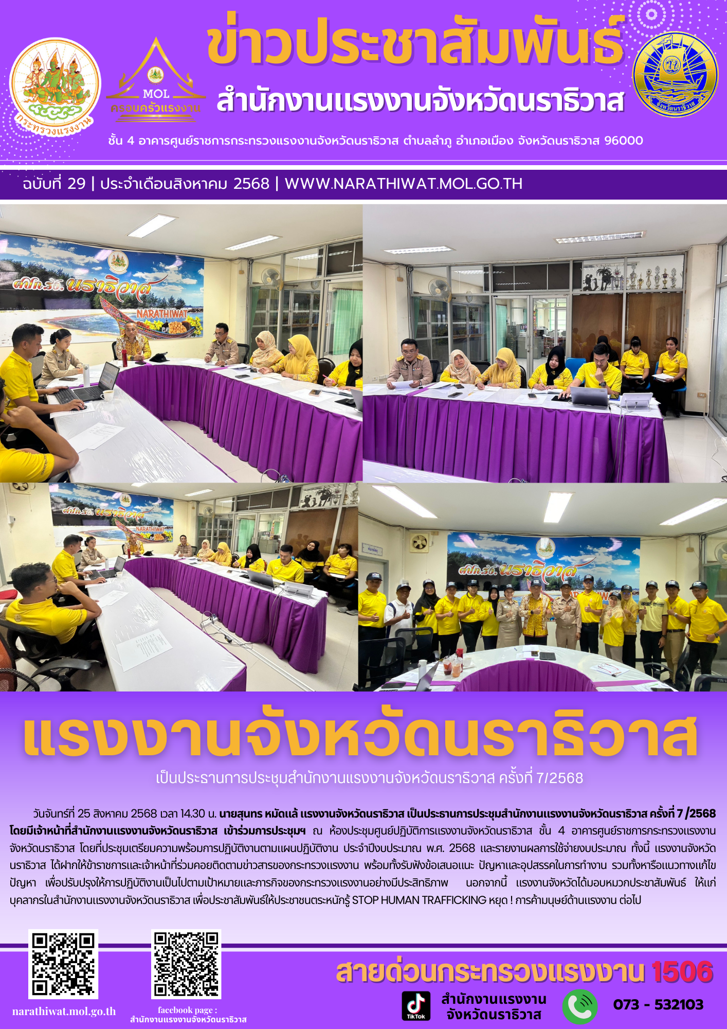 วันจันทร์ที่ 25 สิงหาคม 2568 เวลา 14.30 น. นายสุนทร หมัดแล้ แรงงานจังหวัดนราธิวาส เป็นประธานการประชุมสำนักงานแรงงานจังหวัดนราธิวาส ครั้งที่ 7 /2568 โดยมีเจ้าหน้าที่สำนักงานแรงงานจังหวัดนราธิวาส เข้าร่วมการประชุมฯ ณ ห้องประชุมศูนย์ปฏิบัติการแรงงานจังหวัดนราธิวาส ชั้น 4 อาคารศูนย์ราชการกระทรวงแรงงานจังหวัดนราธิวาส โดยที่ประชุมเตรียมความพร้อมการปฏิบัติงานตามแผนปฏิบัติงาน ประจำปีงบประมาณ พ.ศ. 2568 และรายงานผลการใช้จ่ายงบประมาณ ทั้งนี้ แรงงานจังหวัดนราธิวาส ได้ฝากให้ข้าราชการและเจ้าหน้าที่ร่วมคอยติดตามข่าวสารของกระทรวงแรงงาน พร้อมทั้งรับฟังข้อเสนอแนะ ปัญหาและอุปสรรคในการทำงาน รวมทั้งหารือแนวทางแก้ไขปัญหา เพื่อปรับปรุงให้การปฏิบัติงานเป็นไปตามเป้าหมายและภารกิจของกระทรวงแรงงานอย่างมีประสิทธิภาพ นอกจากนี้ แรงงานจังหวัดได้มอบหมวกประชาสัมพันธ์ ให้แก่บุคลากรในสำนักงานแรงงานจังหวัดนราธิวาส เพื่อประชาสัมพันธ์ให้ประชาชนตระหนักรู้ STOP HUMAN TRAFFICKING หยุด ! การค้ามนุษย์ด้านแรงงาน ต่อไป