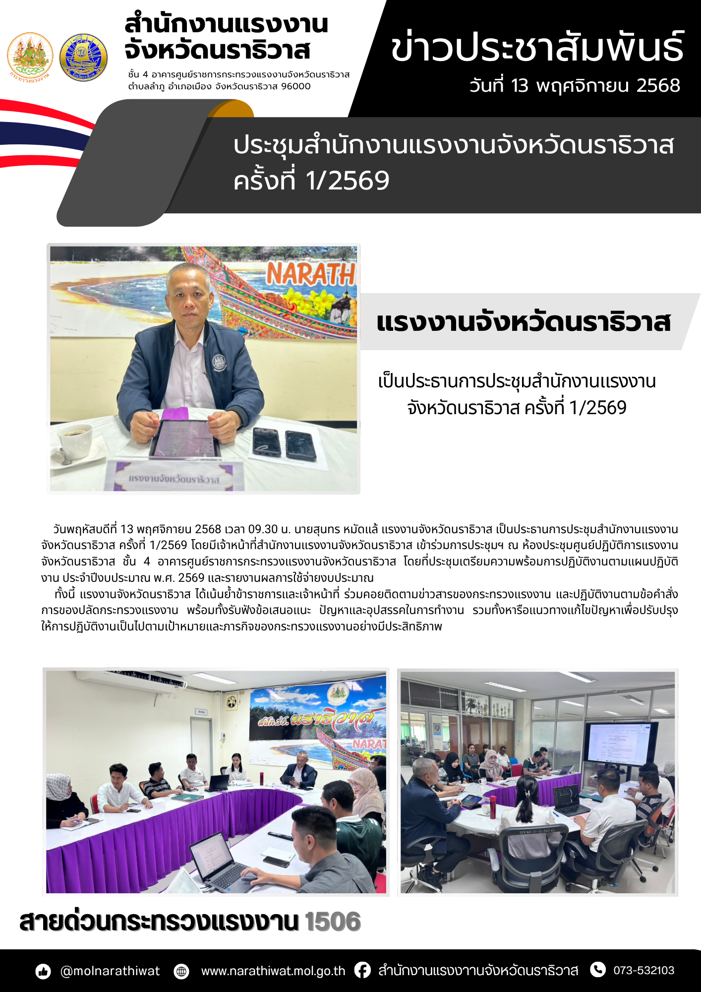 วันพฤหัสบดีที่ 13 พฤศจิกายน 2568 เวลา 09.30 น. นายสุนทร หมัดแล้ แรงงานจังหวัดนราธิวาส เป็นประธานการประชุมสำนักงานแรงงานจังหวัดนราธิวาส ครั้งที่ 1/2569 โดยมีเจ้าหน้าที่สำนักงานแรงงานจังหวัดนราธิวาส เข้าร่วมการประชุมฯ ณ ห้องประชุมศูนย์ปฏิบัติการแรงงานจังหวัดนราธิวาส ชั้น 4 อาคารศูนย์ราชการกระทรวงแรงงานจังหวัดนราธิวาส โดยที่ประชุมเตรียมความพร้อมการปฏิบัติงานตามแผนปฏิบัติงาน ประจำปีงบประมาณ พ.ศ. 2569 และรายงานผลการใช้จ่ายงบประมาณ
