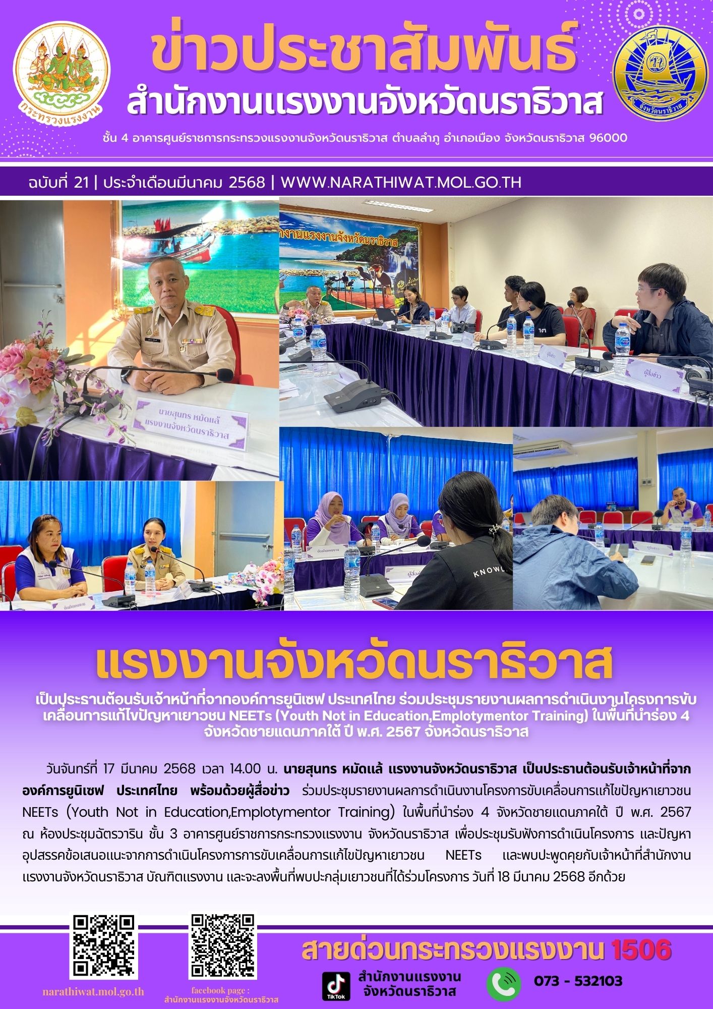 วันจันทร์ที่ 17 มีนาคม 2568 เวลา 14.00 น. นายสุนทร หมัดแล้ แรงงานจังหวัดนราธิวาส เป็นประธานต้อนรับเจ้าหน้าที่จากองค์การยูนิเซฟ ประเทศไทย พร้อมด้วยผู้สื่อข่าว ร่วมประชุมรายงานผลการดำเนินงานโครงการขับเคลื่อนการแก้ไขปัญหาเยาวชน NEETs (Youth Not in Education,Emplotymentor Training) ในพื้นที่นำร่อง 4 จังหวัดชายแดนภาคใต้ ปี พ.ศ. 2567 ณ ห้องประชุมฉัตรวาริน ชั้น 3 อาคารศูนย์ราชการกระทรวงแรงงาน จังหวัดนราธิวาส เพื่อประชุมรับฟังการดำเนินโครงการ และปัญหาอุปสรรคข้อเสนอแนะจากการดำเนินโครงการการขับเคลื่อนการแก้ไขปัญหาเยาวชน NEETs และพบปะพูดคุยกับเจ้าหน้าที่สำนักงานแรงงานจังหวัดนราธิวาส บัณฑิตแรงงาน และจะลงพื้นที่พบปะกลุ่มเยาวชนที่ได้ร่วมโครงการ วันที่ 18 มีนาคม 2568 อีกด้วย