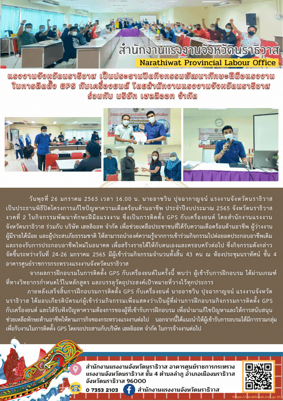 วันพุธที่ 26 มกราคม 2565 เวลา 16.00 น. นายอาชวิน ปุจฉากาญจน์ แรงงานจังหวัดนราธิวาส เป็นประธานพิธีปิดโครงการแก้ไขปัญหาความเดือดร้อนด้านอาชีพ ประจำปีงบประมาณ 2565 จังหวัดนราธิวาส งวดที่ 2 ในกิจกรรมพัฒนาทักษะฝีมือแรงงาน ซึ่งเป็นการติดตั้ง GPS กับเครื่องยนต์ โดยสำนักงานแรงงานจังหวัดนราธิวาส ร่วมกับ บริษัท เฮลลิออท จำกัด เพื่อช่วยเหลือประชาชนที่ได้รับความเดือดร้อนด้านอาชีพ ผู้ว่างงาน ผู้มีรายได้น้อย และผู้ประสบภัยธรรมชาติ ให้สามารถนำองค์ความรู้จากการเข้าร่วมกิจกรรมไปต่อยอดประกอบอาชีพเดิม และรองรับการประกอบอาชีพใหม่ในอนาคต เพื่อสร้างรายได้ให้กับตนเองและครอบครัวต่อไป ซึ่งกิจกรรมดังกล่าวจัดขึ้นระหว่างวันที่ 24-26 มกราคม 2565 มีผู้เข้าร่วมกิจกรรมจำนวนทั้งสิ้น 43 คน ณ ห้องประชุมนราทัศน์ ชั้น 4 อาคารศูนย์ราชการกระทรวงแรงงานจังหวัดนราธิวาส