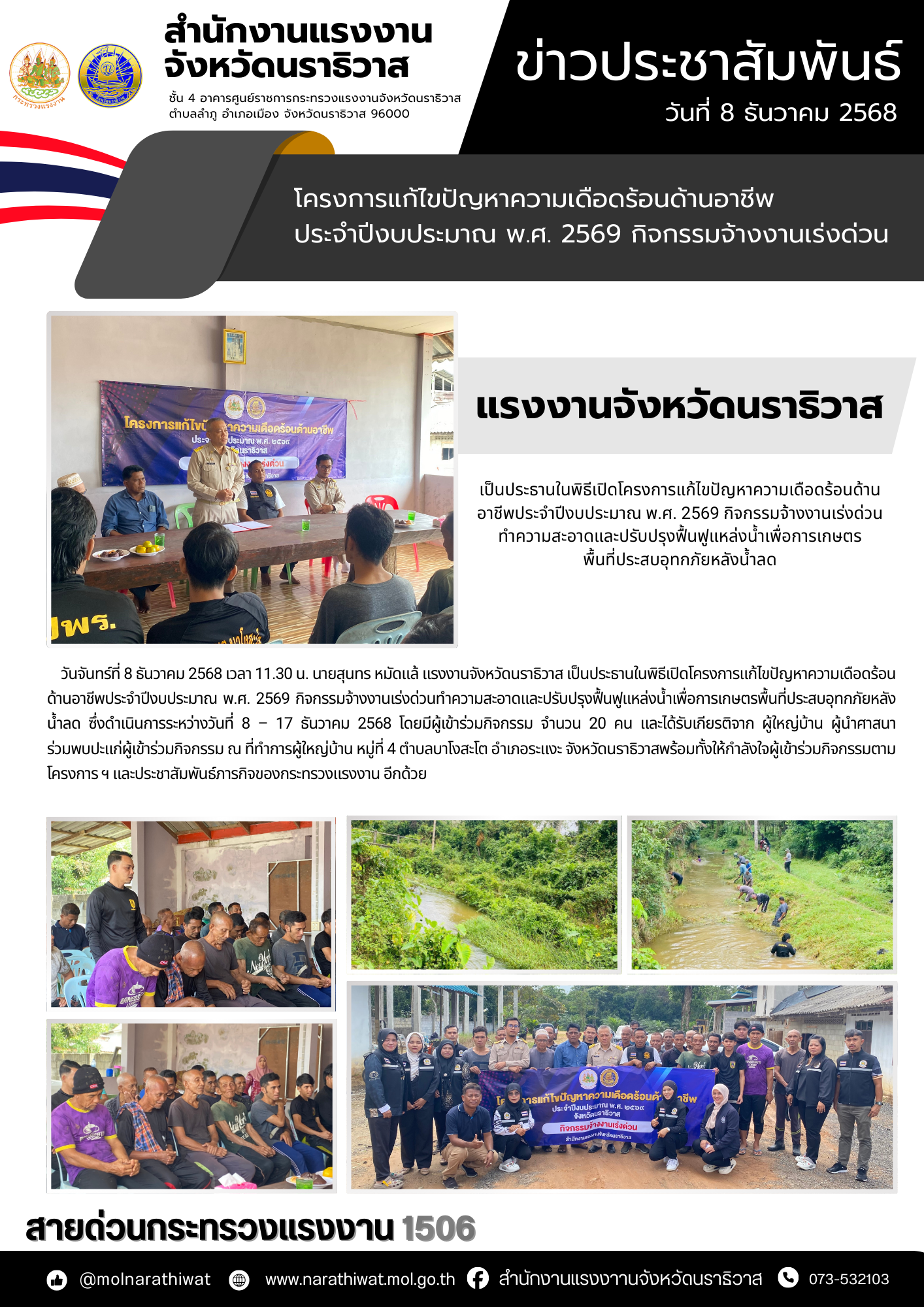 วันจันทร์ที่ 8 ธันวาคม 2568 เวลา 11.30 น. นายสุนทร หมัดแล้ แรงงานจังหวัดนราธิวาส เป็นประธานในพิธีเปิดโครงการแก้ไขปัญหาความเดือดร้อนด้านอาชีพประจำปีงบประมาณ พ.ศ. 2569 กิจกรรมจ้างงานเร่งด่วนทำความสะอาดและปรับปรุงฟื้นฟูแหล่งน้ำเพื่อการเกษตรพื้นที่ประสบอุทกภัยหลังน้ำลด ซึ่งดำเนินการระหว่างวันที่ 8 – 17 ธันวาคม 2568 โดยมีผู้เข้าร่วมกิจกรรม จำนวน 20 คน และได้รับเกียรติจาก ผู้ใหญ่บ้าน ผู้นำศาสนา ร่วมพบปะแก่ผู้เข้าร่วมกิจกรรม ณ ที่ทำการผู้ใหญ่บ้าน หมู่ที่ 4 ตำบลบาโงสะโต อำเภอระแงะ จังหวัดนราธิวาสพร้อมทั้งให้กำลังใจผู้เข้าร่วมกิจกรรมตามโครงการ ฯ และประชาสัมพันธ์ภารกิจของกระทรวงแรงงาน อีกด้วย