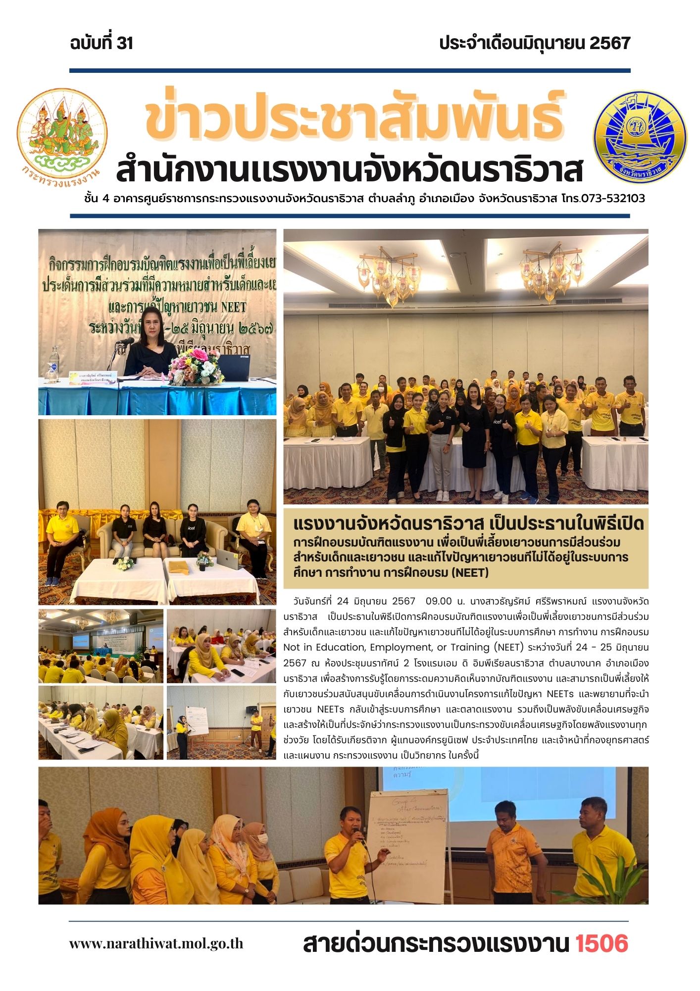 วันจันทร์ที่ 24 มิถุนายน 2567 09.00 น. นางสาวธัญรัศม์ ศรีริพราหมณ์ แรงงานจังหวัดนราธิวาส เป็นประธานในพิธีเปิดการฝึกอบรมบัณฑิตแรงงานเพื่อเป็นพี่เลี้ยงเยาวชนการมีส่วนร่วมสำหรับเด็กและเยาวชน และแก้ไขปัญหาเยาวชนทีไม่ได้อยู่ในระบบการศึกษา การทำงาน การฝึกอบรม Not in Education, Employment, or Training (NEET) ระหว่างวันที่ 24 – 25 มิถุนายน 2567 ณ ห้องประชุมนราทัศน์ 2 โรงแรมเอม ดิ อิมพีเรียลนราธิวาส ตำบลบางนาค อำเภอเมืองนราธิวาส เพื่อสร้างการรับรู้โดยการระดมความคิดเห็นจากบัณฑิตแรงงาน และสามารถเป็นพี่เลี้ยงให้กับเยาวชนร่วมสนับสนุนขับเคลื่อนการดำเนินงานโครงการแก้ไขปัญหา NEETs และพยายามที่จะนำเยาวชน NEETs กลับเข้าสู่ระบบการศึกษา และตลาดแรงงาน รวมถึงเป็นพลังขับเคลื่อนเศรษฐกิจ และสร้างให้เป็นที่ประจักษ์ว่ากระทรวงแรงงานเป็นกระทรวงขับเคลื่อนเศรษฐกิจโดยพลังแรงงานทุกช่วงวัย โดยได้รับเกียรติจาก ผู้แทนองค์กรยูนิเซฟ ประจำประเทศไทย และเจ้าหน้าที่กองยุทธศาสตร์และแผนงาน กระทรวงแรงงาน เป็นวิทยากร ในครั้งนี้