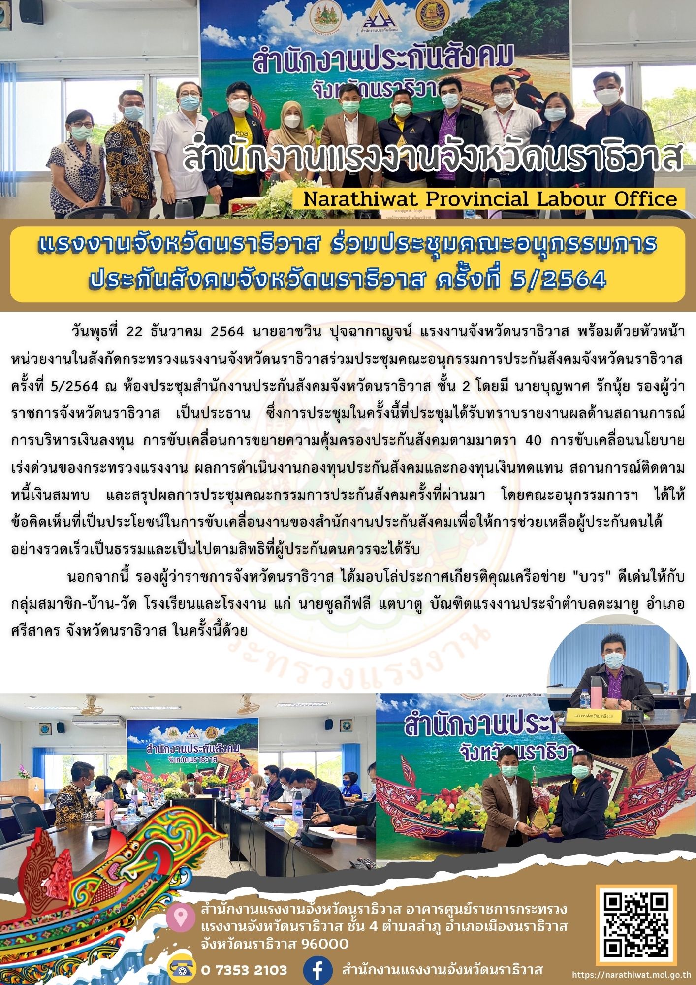 วันพุธที่ 22 ธันวาคม 2564 นายอาชวิน ปุจฉากาญจน์ แรงงานจังหวัดนราธิวาส พร้อมด้วยหัวหน้าหน่วยงานในสังกัดกระทรวงแรงงานจังหวัดนราธิวาสร่วมประชุมคณะอนุกรรมการประกันสังคมจังหวัดนราธิวาส ครั้งที่ 5/2564 ณ ห้องประชุมสำนักงานประกันสังคมจังหวัดนราธิวาส ชั้น 2 โดยมี นายบุญพาศ รักนุ้ย รองผู้ว่าราชการจังหวัดนราธิวาส เป็นประธาน ซึ่งการประชุมในครั้งนี้ที่ประชุมได้รับทราบรายงานผลด้านสถานการณ์การบริหารเงินลงทุน การขับเคลื่อนการขยายความคุ้มครองประกันสังคมตามมาตรา 40 การขับเคลื่อนนโยบายเร่งด่วนของกระทรวงแรงงาน ผลการดำเนินงานกองทุนประกันสังคมและกองทุนเงินทดแทน สถานการณ์ติดตามหนี้เงินสมทบ และสรุปผลการประชุมคณะกรรมการประกันสังคมครั้งที่ผ่านมา โดยคณะอนุกรรมการฯ ได้ให้ข้อคิดเห็นที่เป็นประโยชน์ในการขับเคลื่อนงานของสำนักงานประกันสังคมเพื่อให้การช่วยเหลือผู้ประกันตนได้อย่างรวดเร็วเป็นธรรมและเป็นไปตามสิทธิที่ผู้ประกันตนควรจะได้รับ