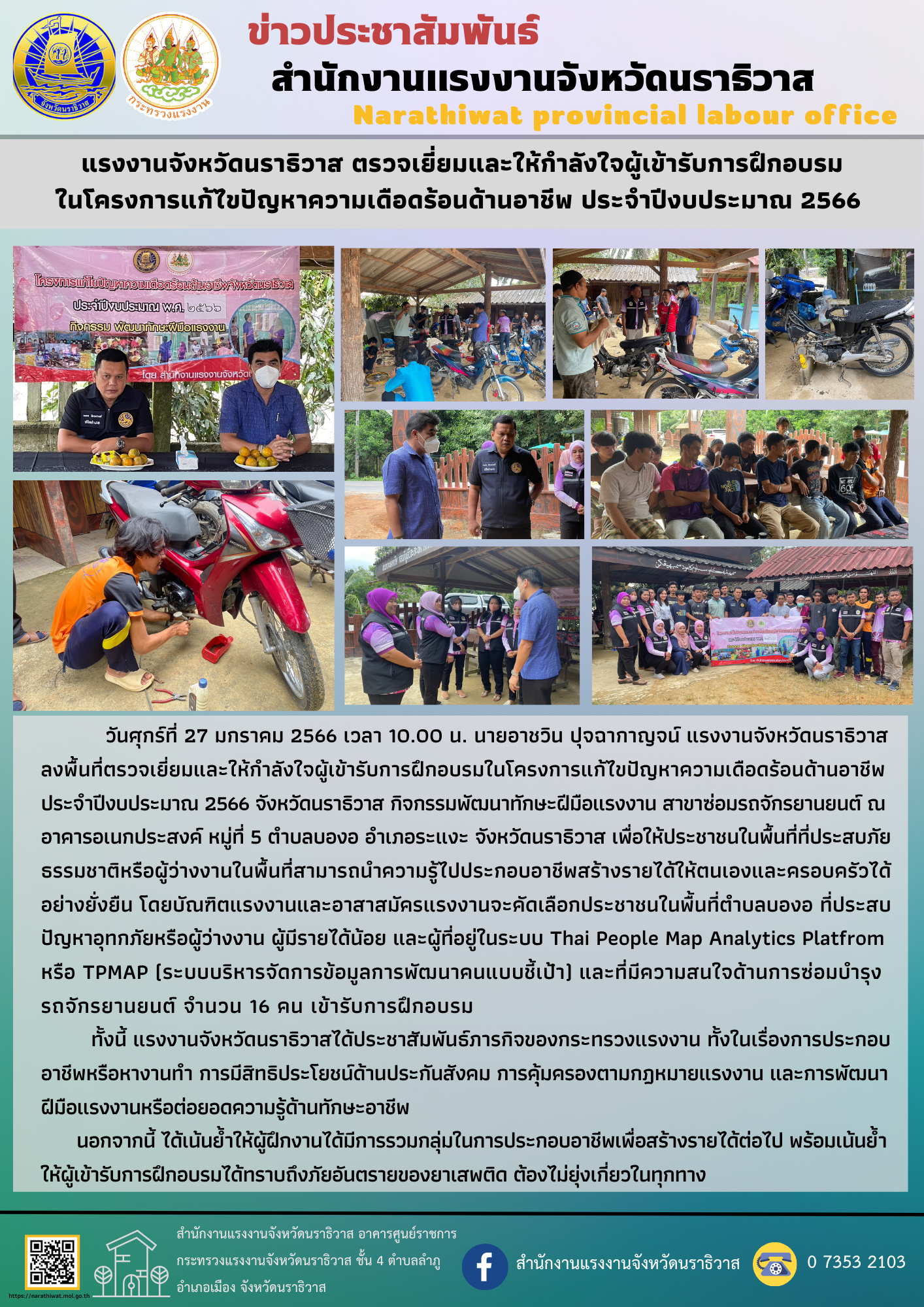 วันศุกร์ที่ 27 มกราคม 2566 เวลา 10.00 น. นายอาชวิน ปุจฉากาญจน์ แรงงานจังหวัดนราธิวาสลงพื้นที่ตรวจเยี่ยมและให้กำลังใจผู้เข้ารับการฝึกอบรมในโครงการแก้ไขปัญหาความเดือดร้อนด้านอาชีพ ประจำปีงบประมาณ 2566 จังหวัดนราธิวาส กิจกรรมพัฒนาทักษะฝีมือแรงงาน สาขาซ่อมรถจักรยานยนต์ ณ อาคารอเนกประสงค์ หมู่ที่ 5 ตำบลบองอ อำเภอระแงะ จังหวัดนราธิวาส เพื่อให้ประชาชนในพื้นที่ที่ประสบภัยธรรมชาติหรือผู้ว่างงานในพื้นที่สามารถนำความรู้ไปประกอบอาชีพสร้างรายได้ให้ตนเองและครอบครัวได้อย่างยั่งยืน โดยบัณฑิตแรงงานและอาสาสมัครแรงงานจะคัดเลือกประชาชนในพื้นที่ตำบลบองอ ที่ประสบปัญหาอุทกภัยหรือผู้ว่างงาน ผู้มีรายได้น้อย และผู้ที่อยู่ในระบบ Thai People Map Analytics Platfrom หรือ TPMAP (ระบบบริหารจัดการข้อมูลการพัฒนาคนแบบชี้เป้า) และที่มีความสนใจด้านการซ่อมบำรุงรถจักรยานยนต์ จำนวน 16 คน เข้ารับการฝึกอบรม ทั้งนี้ แรงงานจังหวัดนราธิวาสได้ประชาสัมพันธ์ภารกิจของกระทรวงแรงงาน ทั้งในเรื่องการประกอบอาชีพหรือหางานทำ การมีสิทธิประโยชน์ด้านประกันสังคม การคุ้มครองตามกฎหมายแรงงาน และการพัฒนาฝีมือแรงงานหรือต่อยอดความรู้ด้านทักษะอาชีพนอกจากนี้ ได้เน้นย้ำให้ผู้ฝึกงานได้มีการรวมกลุ่มในการประกอบอาชีพเพื่อสร้างรายได้ต่อไป พร้อมเน้นย้ำให้ผู้เข้ารับการฝึกอบรมได้ทราบถึงภัยอันตรายของยาเสพติด ต้องไม่ยุ่งเกี่ยวในทุกทาง