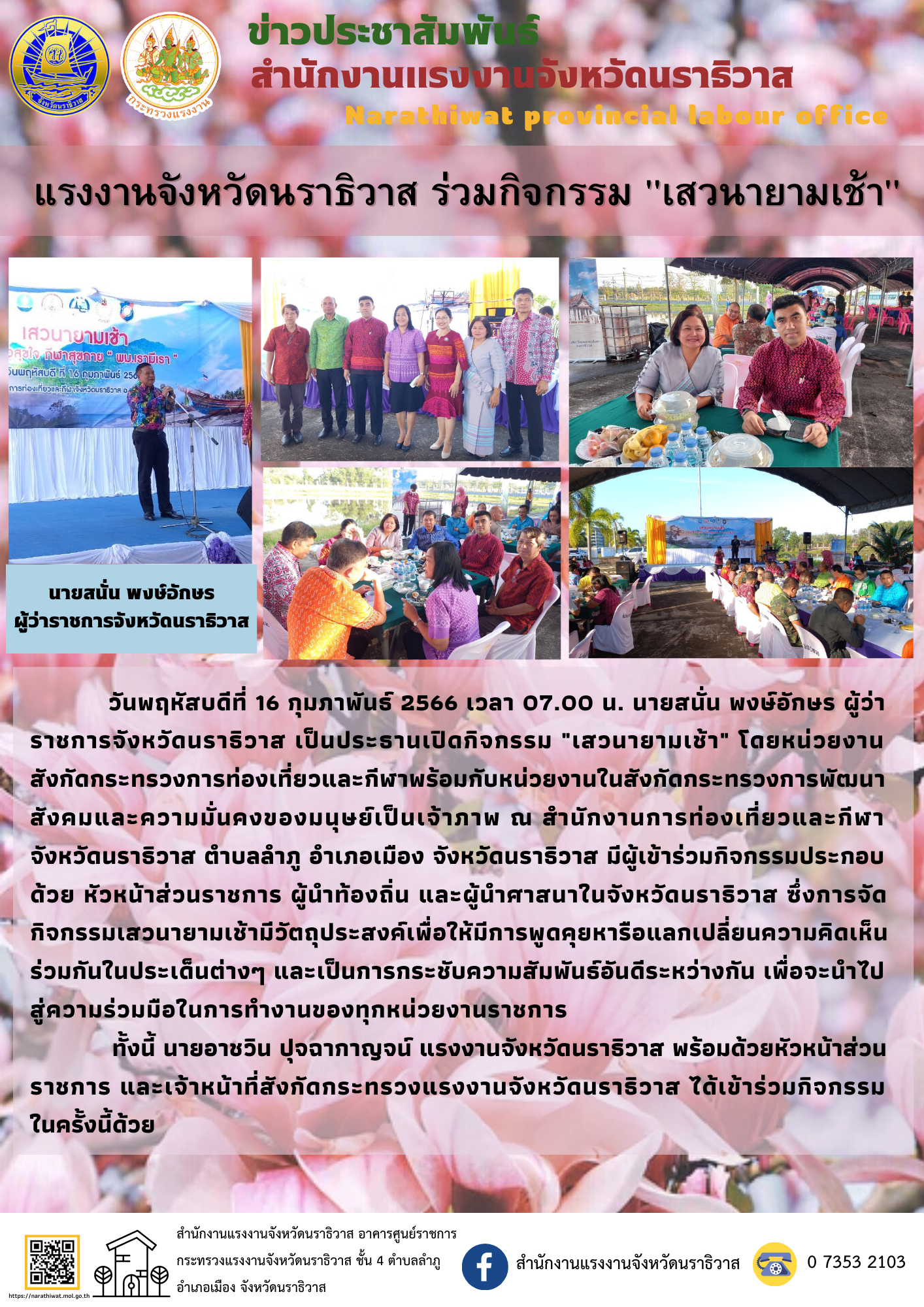 วันพฤหัสบดีที่ 16 กุมภาพันธ์ 2566 เวลา 07.00 น. นายสนั่น พงษ์อักษร ผู้ว่าราชการจังหวัดนราธิวาส เป็นประธานเปิดกิจกรรม “เสวนายามเช้า” โดยหน่วยงานสังกัดกระทรวงการท่องเที่ยวและกีฬาพร้อมกับหน่วยงานในสังกัดกระทรวงการพัฒนาสังคมและความมั่นคงของมนุษย์เป็นเจ้าภาพ ณ สำนักงานการท่องเที่ยวและกีฬาจังหวัดนราธิวาส ตำบลลำภู อำเภอเมือง จังหวัดนราธิวาส มีผู้เข้าร่วมกิจกรรมประกอบด้วย หัวหน้าส่วนราชการ ผู้นำท้องถิ่น และผู้นำศาสนาในจังหวัดนราธิวาส ซึ่งการจัดกิจกรรมเสวนายามเช้ามีวัตถุประสงค์เพื่อให้มีการพูดคุยหารือแลกเปลี่ยนความคิดเห็นร่วมกันในประเด็นต่างๆ และเป็นการกระชับความสัมพันธ์อันดีระหว่างกัน เพื่อจะนำไปสู่ความร่วมมือในการทำงานของทุกหน่วยงานราชการ ทั้งนี้ นายอาชวิน ปุจฉากาญจน์ แรงงานจังหวัดนราธิวาส พร้อมด้วยหัวหน้าส่วนราชการ และเจ้าหน้าที่สังกัดกระทรวงแรงงานจังหวัดนราธิวาส ได้เข้าร่วมกิจกรรมในครั้งนี้ด้วย