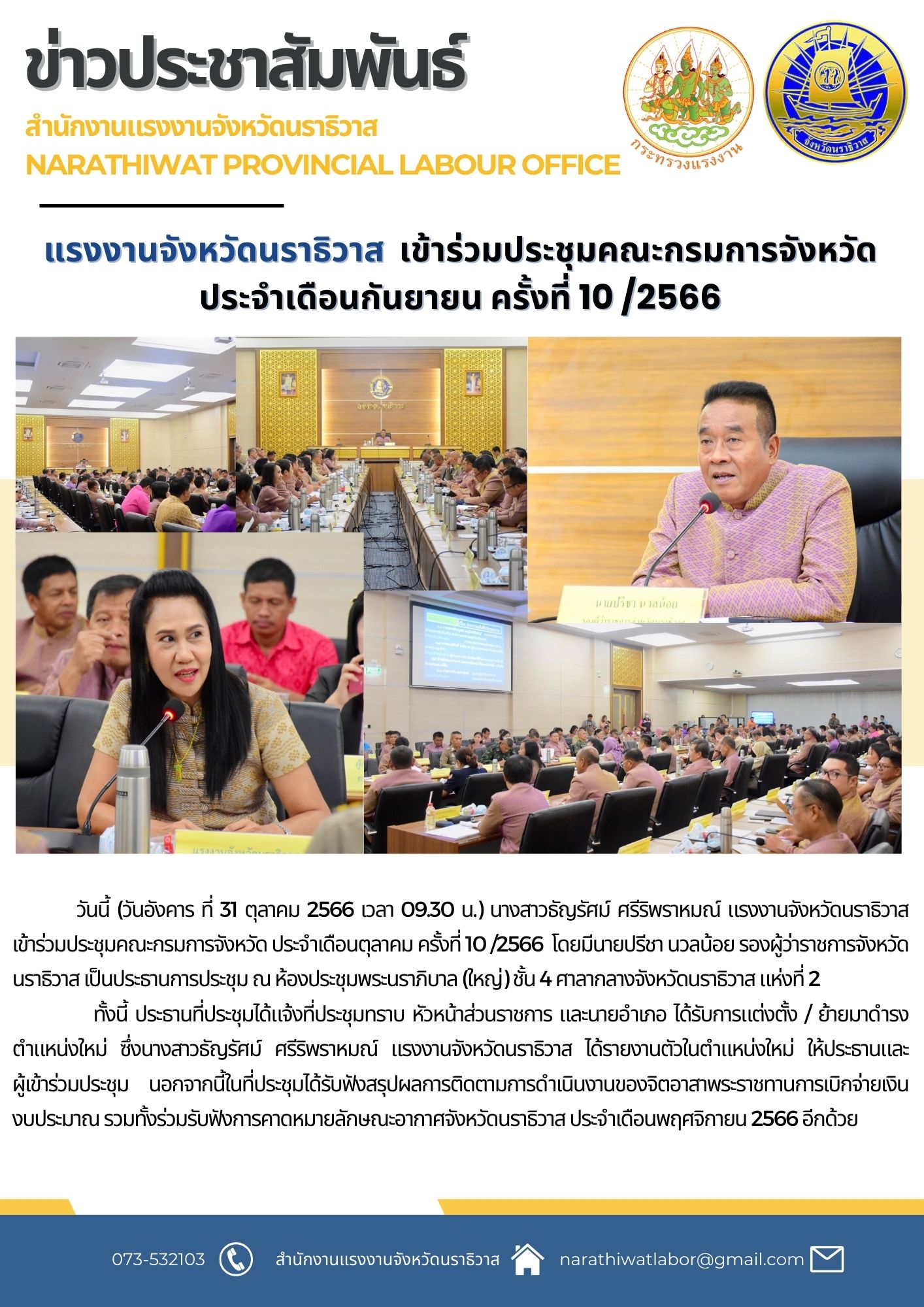 วันนี้ (วันอังคาร ที่ 31 ตุลาคม 2566 เวลา 09.30 น.) นางสาวธัญรัศม์ ศรีริพราหมณ์ แรงงานจังหวัดนราธิวาส เข้าร่วมประชุมคณะกรมการจังหวัด ประจำเดือนตุลาคม ครั้งที่ 10 /2566 โดยมีนายปรีชา นวลน้อย รองผู้ว่าราชการจังหวัดนราธิวาส เป็นประธานการประชุม ณ ห้องประชุมพระนราภิบาล (ใหญ่) ชั้น 4 ศาลากลางจังหวัดนราธิวาส แห่งที่ 2 ทั้งนี้ ประธานที่ประชุมได้แจ้งที่ประชุมทราบ หัวหน้าส่วนราชการ และนายอำเภอ ได้รับการแต่งตั้ง / ย้ายมาดำรงตำแหน่งใหม่ ซึ่งนางสาวธัญรัศม์ ศรีริพราหมณ์ แรงงานจังหวัดนราธิวาส ได้รายงานตัวในตำแหน่งใหม่ ให้ประธานและ ผู้เข้าร่วมประชุม นอกจากนี้ในที่ประชุมได้รับฟังสรุปผลการติดตามการดำเนินงานของจิตอาสาพระราชทานการเบิกจ่ายเงินงบประมาณ รวมทั้งร่วมรับฟังการคาดหมายลักษณะอากาศจังหวัดนราธิวาส ประจำเดือนพฤศจิกายน 2566 อีกด้วย