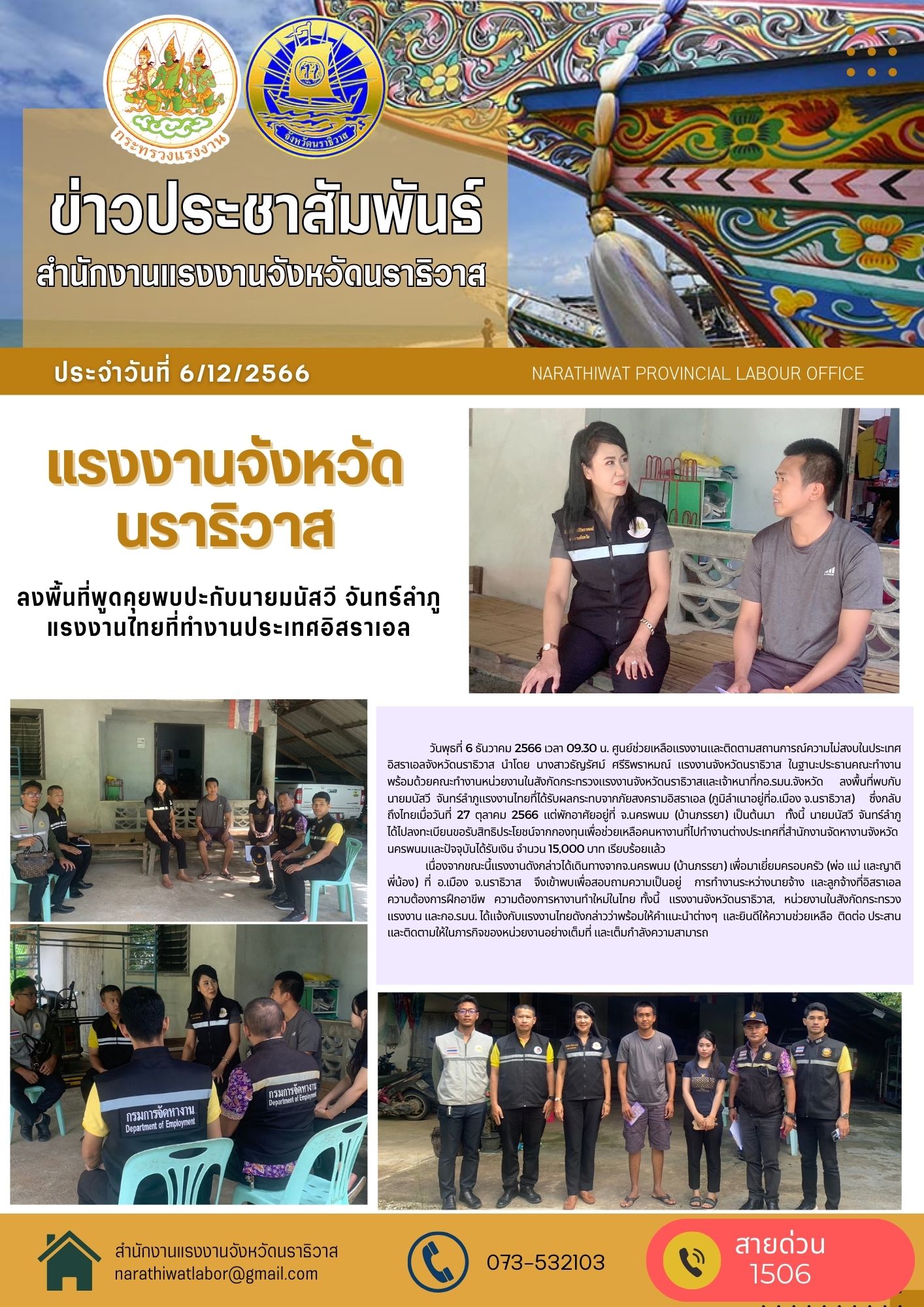 วันพุธที่ 6 ธันวาคม 2566 เวลา 09.30 น. ศูนย์ช่วยเหลือแรงงานและติดตามสถานการณ์ความไม่สงบในประเทศอิสราเอลจังหวัดนราธิวาส นำโดย นางสาวธัญรัศม์ ศรีริพราหมณ์ แรงงานจังหวัดนราธิวาส ในฐานะประธานคณะทำงาน พร้อมด้วยคณะทำงานหน่วยงานในสังกัดกระทรวงแรงงานจังหวัดนราธิวาสและเจ้าหนาที่กอ.รมน.จังหวัด ลงพื้นที่พบกับนายมนัสวี จันทร์ลำภูแรงงานไทยทึ่ได้รับผลกระทบจากภัยสงครามอิสราเอล (ภูมิลำเนาอยู่ที่อ.เมือง จ.นราธิวาส) ซึ่งกลับถึงไทยเมื่อวันที่ 27 ตุลาคม 2566 แต่พักอาศัยอยู่ที่ จ.นครพนม (บ้านภรรยา) เป็นต้นมา ทั้งนี้ นายมนัสวี จันทร์ลำภู ได้ไปลงทะเบียนขอรับสิทธิประโยชน์จากกองทุนเพื่อช่วยเหลือคนหางานที่ไปทำงานต่างประเทศที่สำนักงานจัดหางานจังหวัดนครพนมและปัจจุบันได้รับเงิน จำนวน 15,000 บาท เรียบร้อยแล้วเนื่องจากขณะนี้แรงงานดังกล่าวได้เดินทางจากจ.นครพนม (บ้านภรรยา) เพื่อมาเยี่ยมครอบครัว (พ่อ แม่ และญาติพี่น้อง) ที่ อ.เมือง จ.นราธิวาส จึงเข้าพบเพื่อสอบถามความเป็นอยู่ การทำงานระหว่างนายจ้าง และลูกจ้างที่อิสราเอล ความต้องการฝึกอาขีพ ความต้องการหางานทำใหม่ในไทย ทั้งนี้ แรงงานจังหวัดนราธิวาส, หน่วยงานในสังกัดกระทรวงแรงงาน และกอ.รมน. ได้แจ้งกับแรงงานไทยดังกล่าวว่าพร้อมให้คำแนะนำต่างๆ และยินดีให้ความช่วยเหลือ ติดต่อ ประสาน และติดตามให้ในภารกิจของหน่วยงานอย่างเต็มที่ และเต็มกำลังความสามารถ