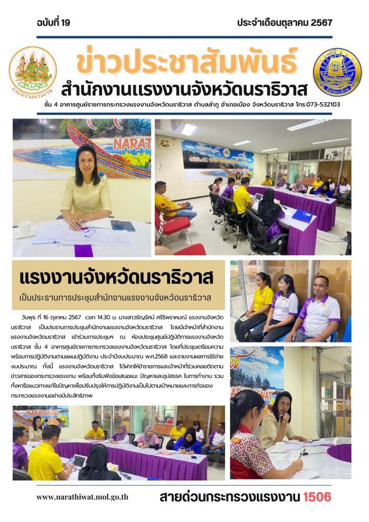 วันพุธ ที่ 16 ตุลาคม 2567 เวลา 14.30 น. นางสาวธัญรัศม์ ศรีริพราหมณ์ แรงงานจังหวัดนราธิวาส เป็นประธานการประชุมสำนักงานแรงงานจังหวัดนราธิวาส โดยมีเจ้าหน้าที่สำนักงานแรงงานจังหวัดนราธิวาส เข้าร่วมการประชุมฯ ณ ห้องประชุมศูนย์ปฏิบัติการแรงงานจังหวัดนราธิวาส ชั้น 4 อาคารศูนย์ราชการกระทรวงแรงงานจังหวัดนราธิวาส โดยที่ประชุมเตรียมความพร้อมการปฏิบัติงานตามแผนปฏิบัติงาน ประจำปีงบประมาณ พ.ศ.2568 และรายงานผลการใช้จ่ายงบประมาณ ทั้งนี้ แรงงานจังหวัดนราธิวาส ได้ฝากให้ข้าราชการและเจ้าหน้าที่ร่วมคอยติดตามข่าวสารของกระทรวงแรงงาน พร้อมทั้งรับฟังข้อเสนอแนะ ปัญหาและอุปสรรค ในการทำงาน รวมทั้งหารือแนวทางแก้ไขปัญหาเพื่อปรับปรุงให้การปฏิบัติงานเป็นไปตามเป้าหมายและภารกิจของกระทรวงแรงงานอย่างมีประสิทธิภาพ