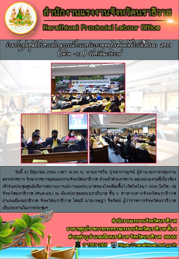 วันนี้ 22 มิถุนายน 2564 เวลา 14.00 น. นายอาชวิน ปุจฉากาญจน์ ผู้อำนวยการกลุ่มงานตรวจราชการ รักษาราชการแทนแรงงานจังหวัดนราธิวาส หัวหน้าส่วนราชการ และหน่วยงานที่เกี่ยวข้อง เข้าร่วมประชุมศูนย์บริหารสถานการณ์การแพร่ระบาดของโรคติดเชื้อไวรัสโคโรนา 2019 (โควิด -19)จังหวัดนราธิวาส (ศบค.นธ.) ณ ห้องประชุมพระนราภิบาล ชั้น 5 ศาลากลางจังหวัดนราธิวาสอำเภอเมืองนราธิวาส จังหวัดนราธิวาส โดยมี นายเจษฎา จิตรัตน์ ผู้ว่าราชการจังหวัดนราธิวาสเป็นประธานในการประชุมฯ