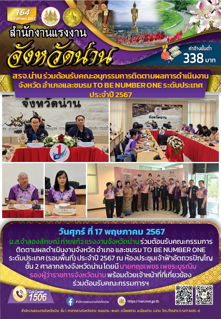 น.ส.จำลองลักษณ์ ก่ายแก้ว แรงงานจังหวัดน่าน ร่วมต้อนรับคณะกรรมการติดตามผลดำเนินงานจังหวัด อำเภอ และชมรม TO BE NUMBER ONE ระดับประเทศ (รอบพื้นที่) ประจำปี 2567 ณ ห้องประชุมเจ้าฟ้าอัตถวรปัญโญ ชั้น 2 ศาลากลางจังหวัดน่าน โดยมี นายกฤชเพชร เพชระบูรณิน รองผู้ว่าราชการจังหวัดน่าน พร้อมด้วยเจ้าหน้าที่ที่เกี่ยวข้องร่วมต้อนรับคณะกรรมการฯ