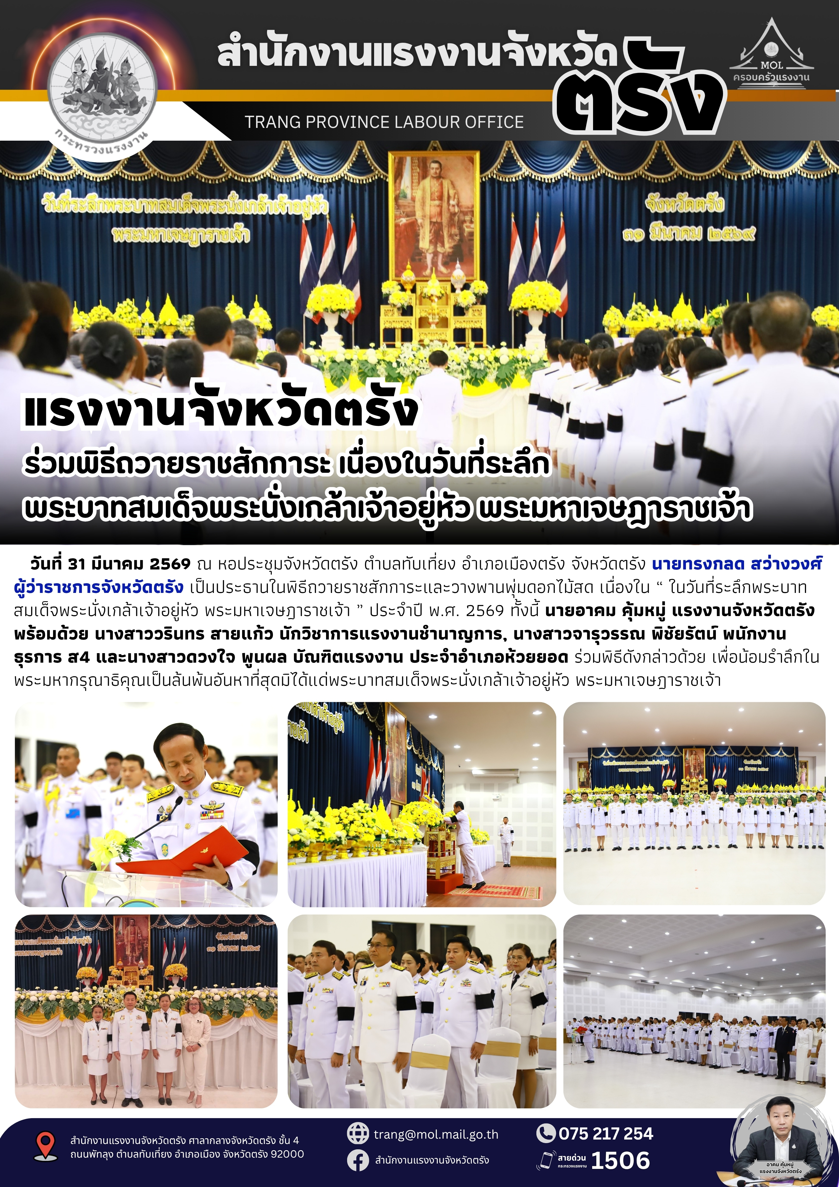 แรงงานจังหวัดตรัง ร่วมพิธีถวายราชสักการะ เนื่องในวันที่ระลึกพระบาทสมเด็จพระนั่งเกล้าเจ้าอยู่หัว พระมหาเจษฎาราชเจ้า