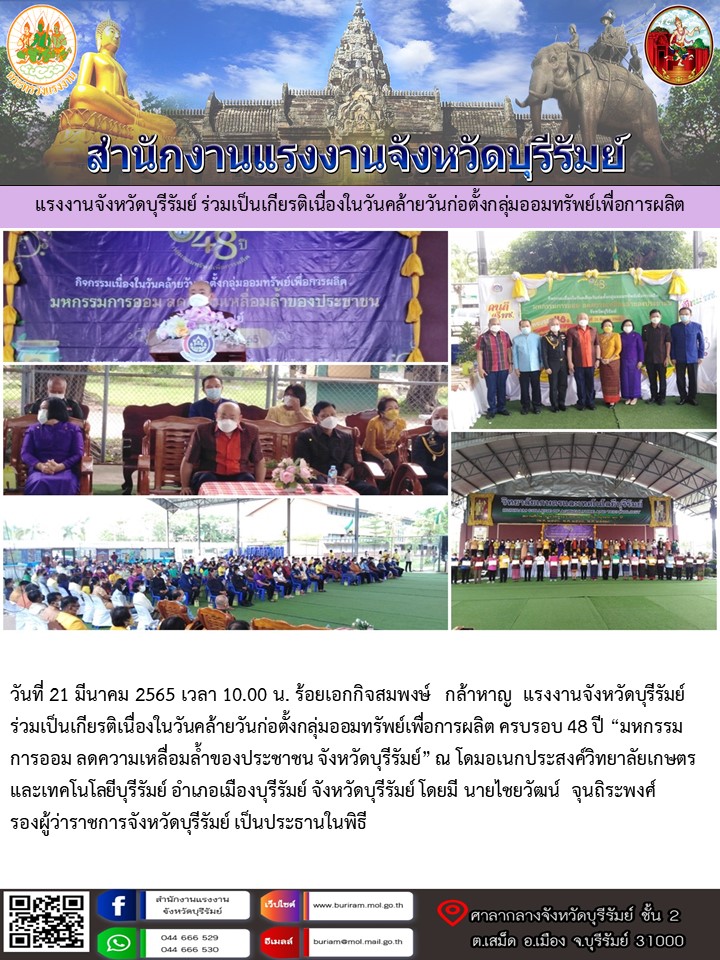 แรงงานจังหวัดบุรีรัมย์ ร่วมเป็นเกียรติเนื่องในวันคล้ายวันก่อตั้งกลุ่มออมทรัพย์เพื่อการผลิต