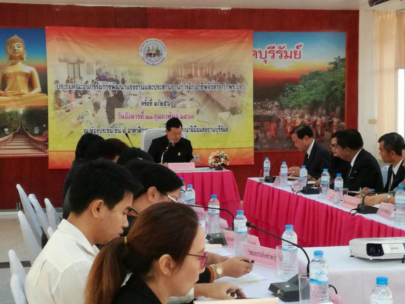 วันที่ ๒๑ กุมภาพันธ์ ๒๕๖๐ เวลา ๑๐.๐๐ น. สำนักงานพัฒนาฝีมือแรงงานบุรีรัมย์ ดำเนินการจัดประชุมคณะอนุกรรมการพัฒนาแรงงานและประสานงานการฝึกอาชีพจังหวัด (กพร.ปจ.) ครั้งที่ ๑/๒๕๖๐ มีคณะกรรมการจากหน่วยงานภาครัฐและภาคเอกชน (หน่วยงานสังกัดกระทรวงแรงงานทุกหน่วยเป็นกรรมการและเข้าร่วมประชุม) และผู้ทรงคุณวุฒิเข้าร่วมประชุม จำนวน ๒๓ คน โดยรองผู้ว่าราชการจังหวัด นายดำรงชัย เนรมิตตกพงศ์ เป็นประธาน