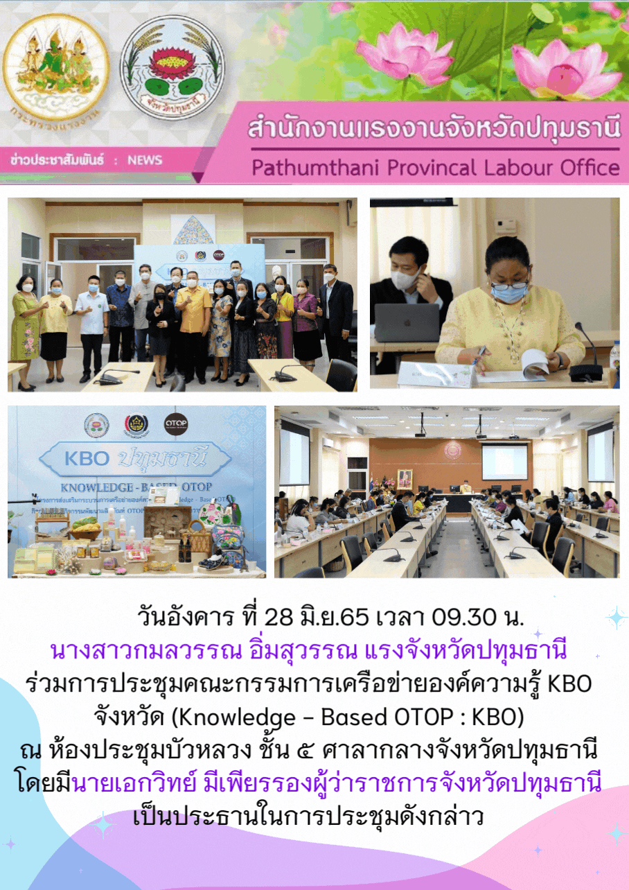 แรงงานจังหวัดปทุมธานี ร่วมการประชุมคณะกรรมการเครือข่ายองค์ความรู้ KBO จังหวัด (Knowledge – Based OTOP : KBO)