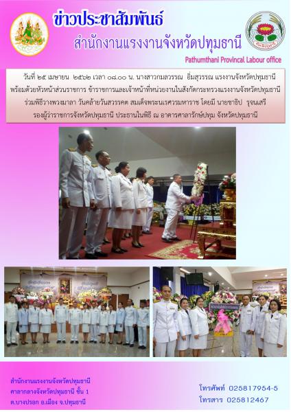 แรงงานจังหวัดปทุมธานี พร้อมด้วยหัวหน้าส่วนราชการ ข้าราชการและเจ้าหน้าที่หน่วยงานในสังกัดกระทรวงแรงงานจังหวัดปทุมธานีร่วมพิธีวางพวงมาลา วันคล้ายวันสวรรคต สมเด็จพระนเรศวรมหาราช