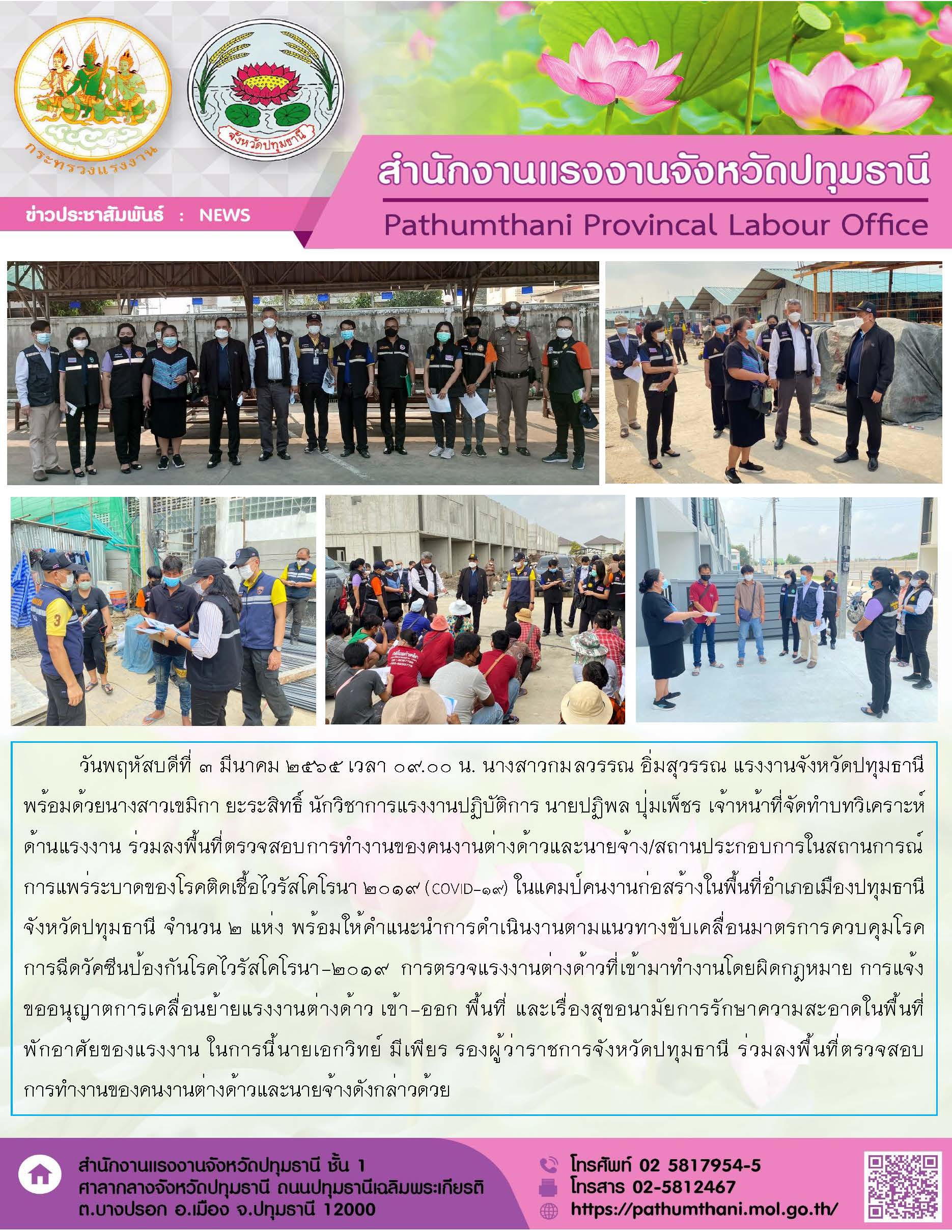 แรงงานจังหวัดปทุมธานี พร้อมด้วยเจ้าหน้าที่สำนักงานแรงงานจังหวัดปทุมธานี ลงพื้นที่ตรวจสอบการทำงานของคนต่างด้าวและนายจ้างฯ ในพื้นที่อำเภอเมืองปทุมธานี จังหวัดปทุมธานี