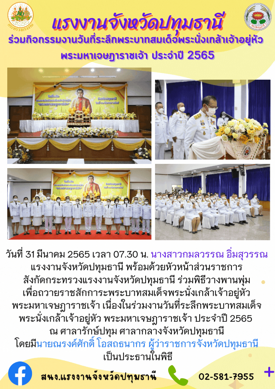 แรงงานจังหวัดปทุมธานี ร่วมพิธีวางพานพุ่มเพื่อถวายราชสักการะเนื่องในร่วมงานวันที่ระลึกพระบาทสมเด็จพระนั่งเกล้าเจ้าอยู่หัว พระมหาเจษฎาราชเจ้า ประจำปี 2565