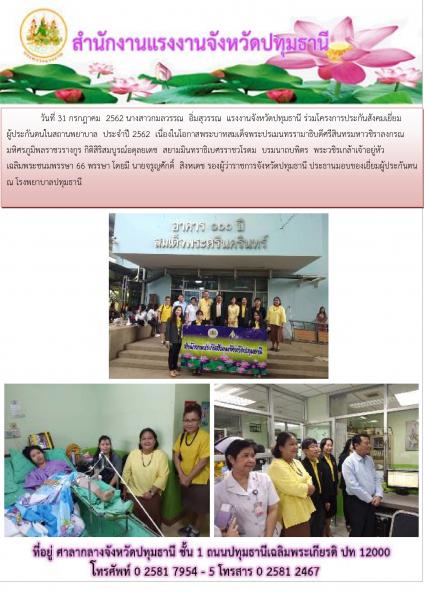 แรงงานจังหวัดปทุมธานี ร่วมโครงการประกันสังคมเยี่ยมผู้ประกันตนในสถานพยาบาล ประจำปี 2562 ณ โรงพยาบาลปทุมธานี