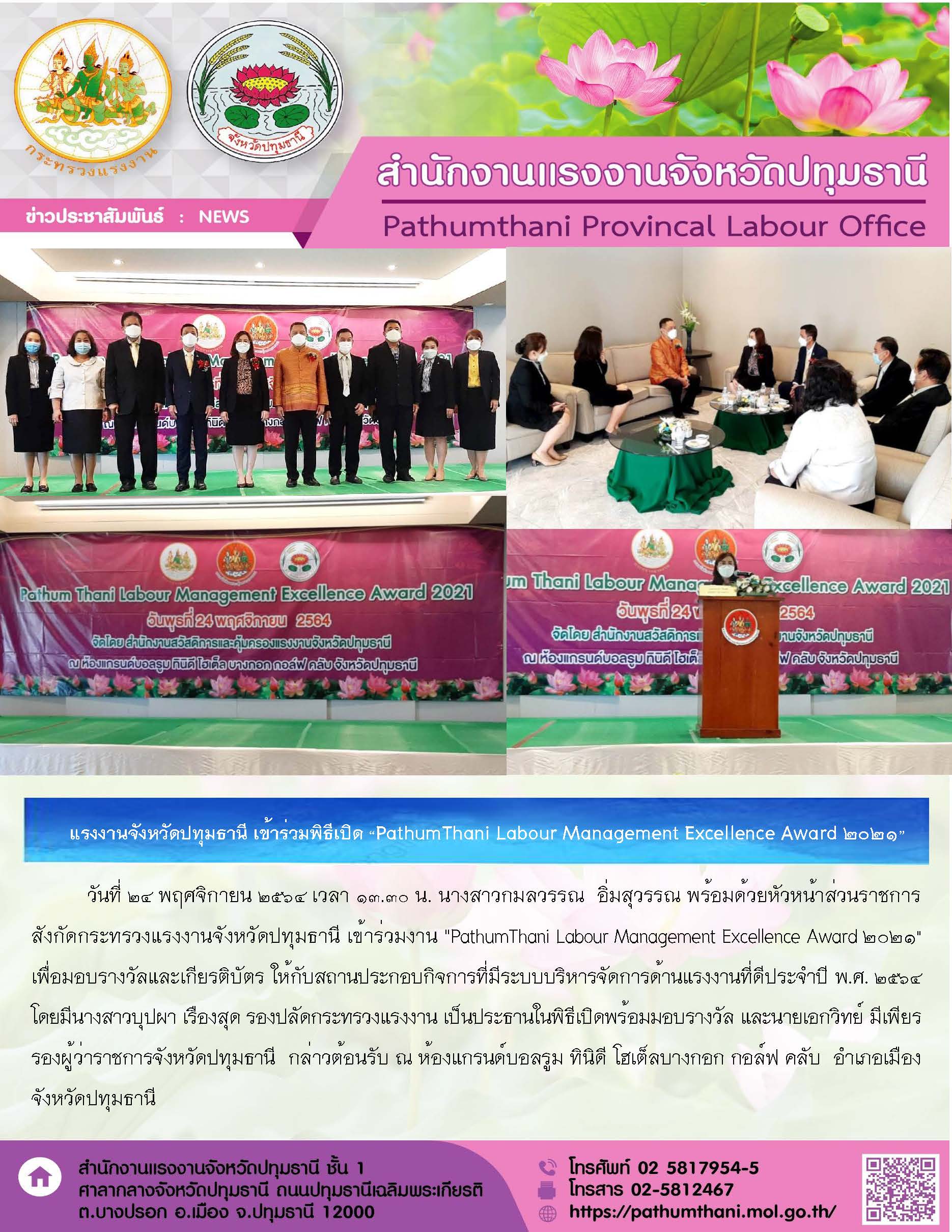 แรงงานจังหวัดปทุมธานี เข้าร่วมพิธีเปิดงาน “PathumThani Labour Management Excellence Award 2021”